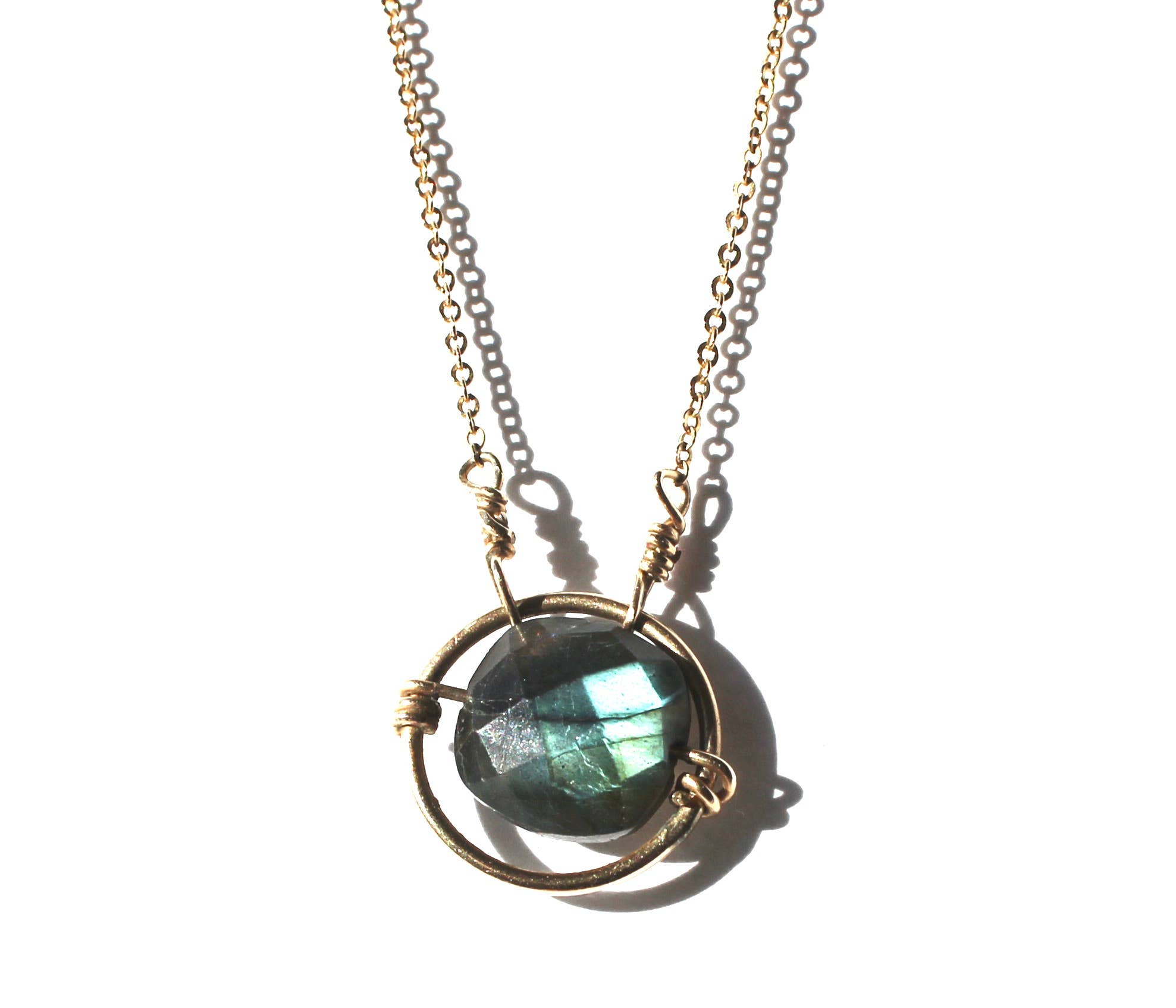 Fio de pedra de calcedônia verde-mar enrolado dentro de um círculo cheio de ouro 14k