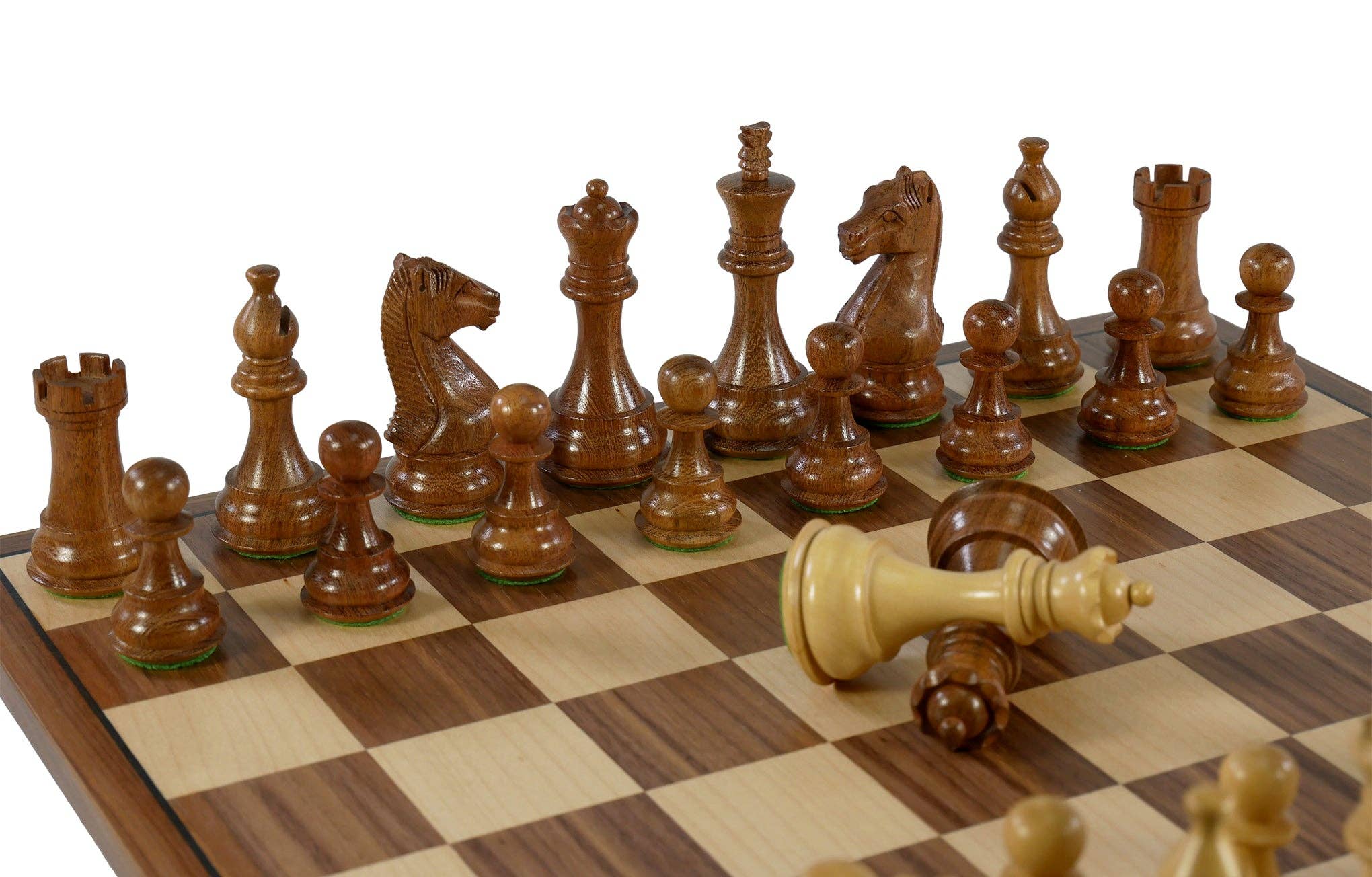 Conjunto de xadrez Botticino e Ônix Vermelho de 40,6 cm x 40,6 cm (16" x 16") com estojo prático em couro sintético para armazenamento. A altura do rei é de 8,26 cm (3,25") e as casas do tabuleiro medem 3,81 cm (1,5"). Todas as peças possuem base felpuda, assim como o tabuleiro, para evitar riscos em qualquer superfície.
