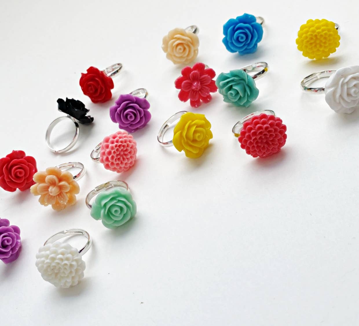 Anéis de flor de resina divertidos + coloridos Vendidos por uma dúzia (12 anéis), em cores e flores variadas, são ótimos para todas as idades e são um ótimo acessório (a um ótimo preço) para alegrar seu estilo —DETALHES— Base de anel ajustável (Chumbo+sem cádmio, metal banhado a prata) Adapta-se à maioria dos adolescentes e adultos Flor de resina colorida em desenhos variados (rosa, dália, mãe e muito mais!) Vendido à dúzia como um sortimento misto* * Se você estiver REORDENANDO e precisar de cores específicas para completar seu estoque, informe-nos e faremos o possível para atender à sua solicitação!