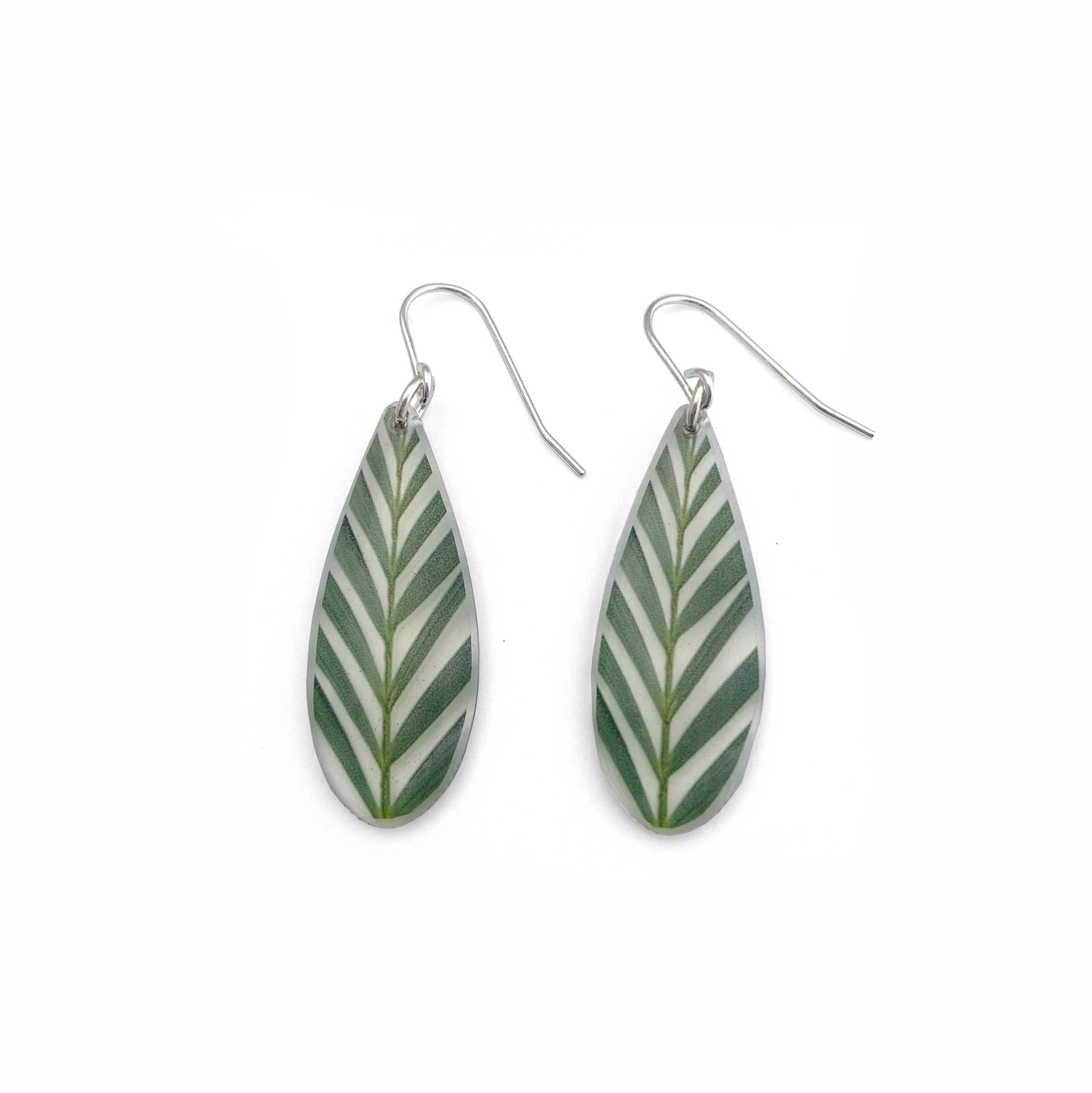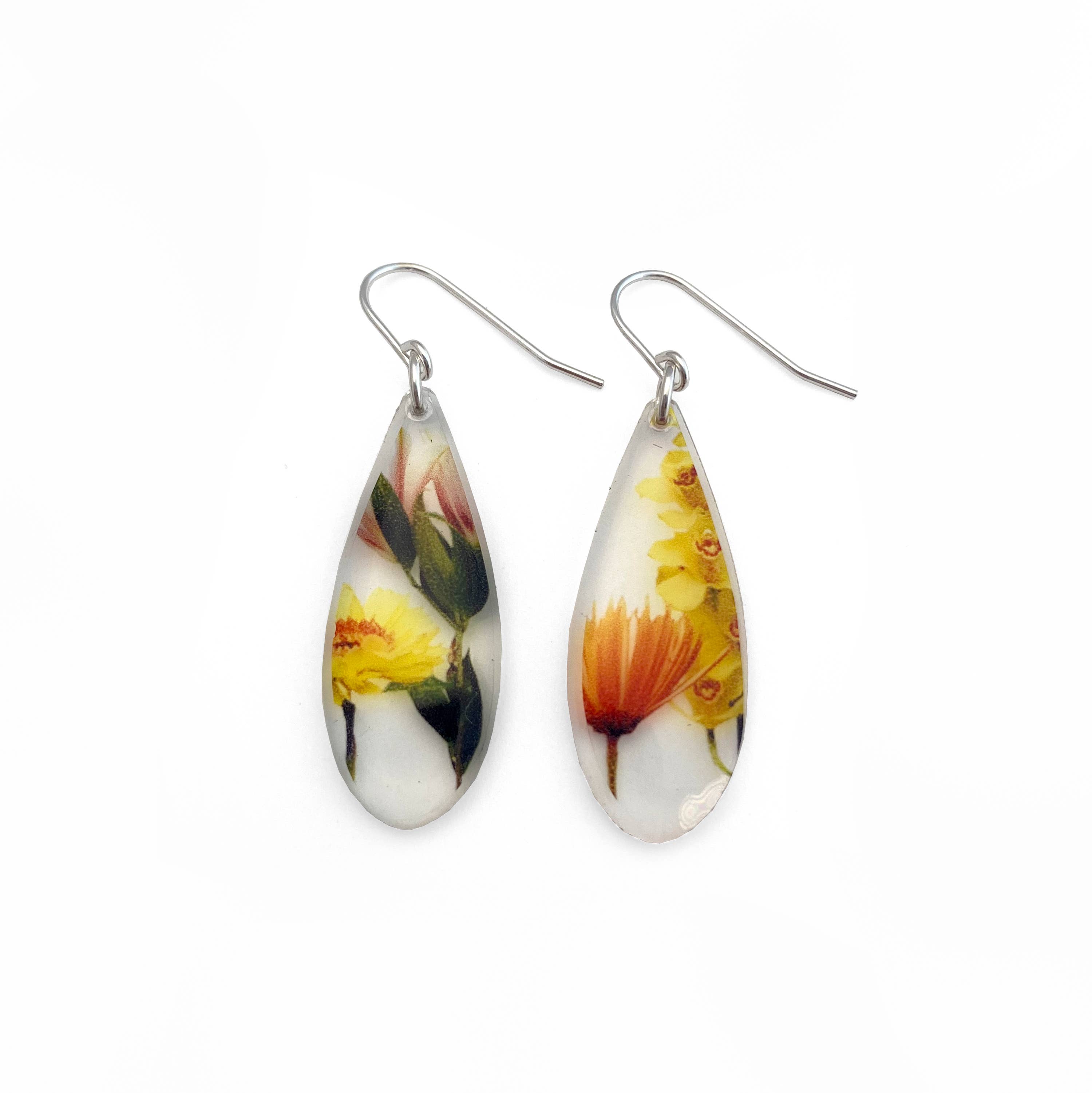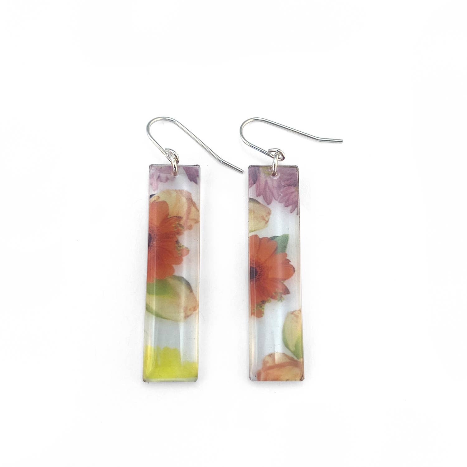Brincos fotográficos transparentes feitos à mão com acrílico, resina e uma fotografia de botânicos coloridos. 1-1/4 “de altura, 1/8" de espessura. Fios de ouvido de prata esterlina. Esses brincos são claros, então o que estiver por trás dos brincos será o plano de fundo da imagem, tornando-os bastante sutis de certos ângulos. Há uma foto adicional de brincos semelhantes sendo usados, bem como uma foto dos brincos conforme eles vêm, embalados.
