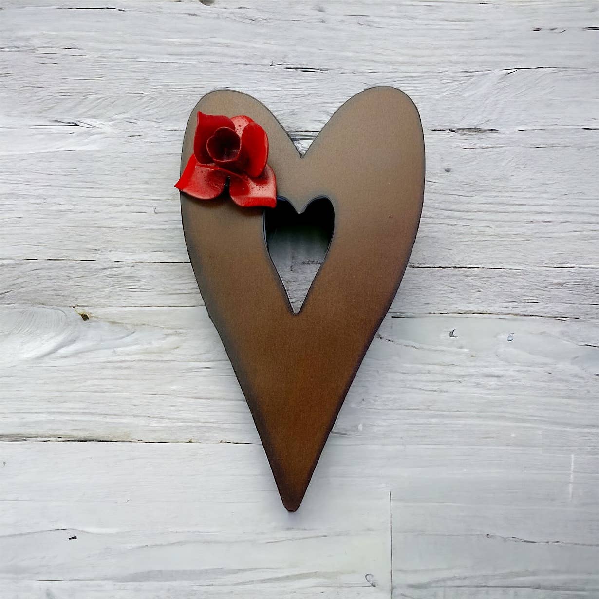 Estes corações são super divertidos e rechonchudos, com um íman de flor de metal pintado em várias cores. 17,8 cm de altura com gancho na parte de trás e a parte de trás é acabada em ferrugem. Fabricado nos EUA.