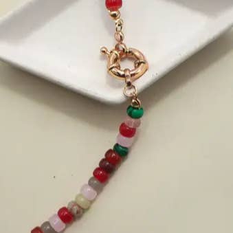 Colar de contas de vidro ágata natural semi-preciosa, um acessório impressionante que apresenta uma vibrante combinação de contas de vidro e pedras semi-preciosas. Uma peça deslumbrante que une elegância a um charme colorido e vibrante. Este colar possui uma seleção manual de contas de vidro e pedras semi-preciosas, incluindo a bela ágata natural, organizadas para criar um motivo cativante e colorido. Detalhes do produto: - Comprimento: 40,6 cm (16") - Extensão: extensor de corrente com bola de 7,6 cm (3") - Fecho: fecho tipo lagosta - Acabamento metálico: folheado a ouro - Produto conforme normas de chumbo e níquel - Tratamento anti-oxidação: Dupla camada de revestimento eletrônico