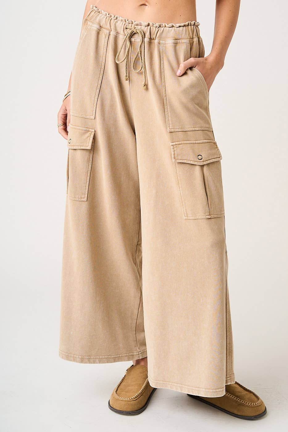 - TECIDO DE MALHA FELPUDA FRANCESA DE ALGODÃO - CALÇAS DE PERNAS LARGAS DE AJUSTE DESCONTRAÍDO - TORNOZLE/COMPRIMENTO TOTAL - CINTURA ELÁSTICA COBERTA COM CORDÃO - BOLSOS LATERAIS - DETALHE DO BOLSO DA CARGA UTILITÁRIA - DETALHE DA COSTURA EXPOSTA - LAVAGEM MINERAL ESTILIZADO COM: S15219 MODELO MEDE 1,70M E VESTE TAMANHO PEQUENO primavera, verão, calças cargo, bolso utilitário, corte solto, casual, lavado, cintura elástica, cintura gravata, ponto exposto, costura, bolso de remendo, aba, boho, boêmio