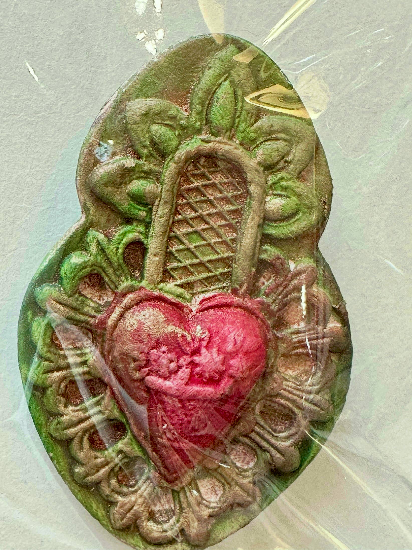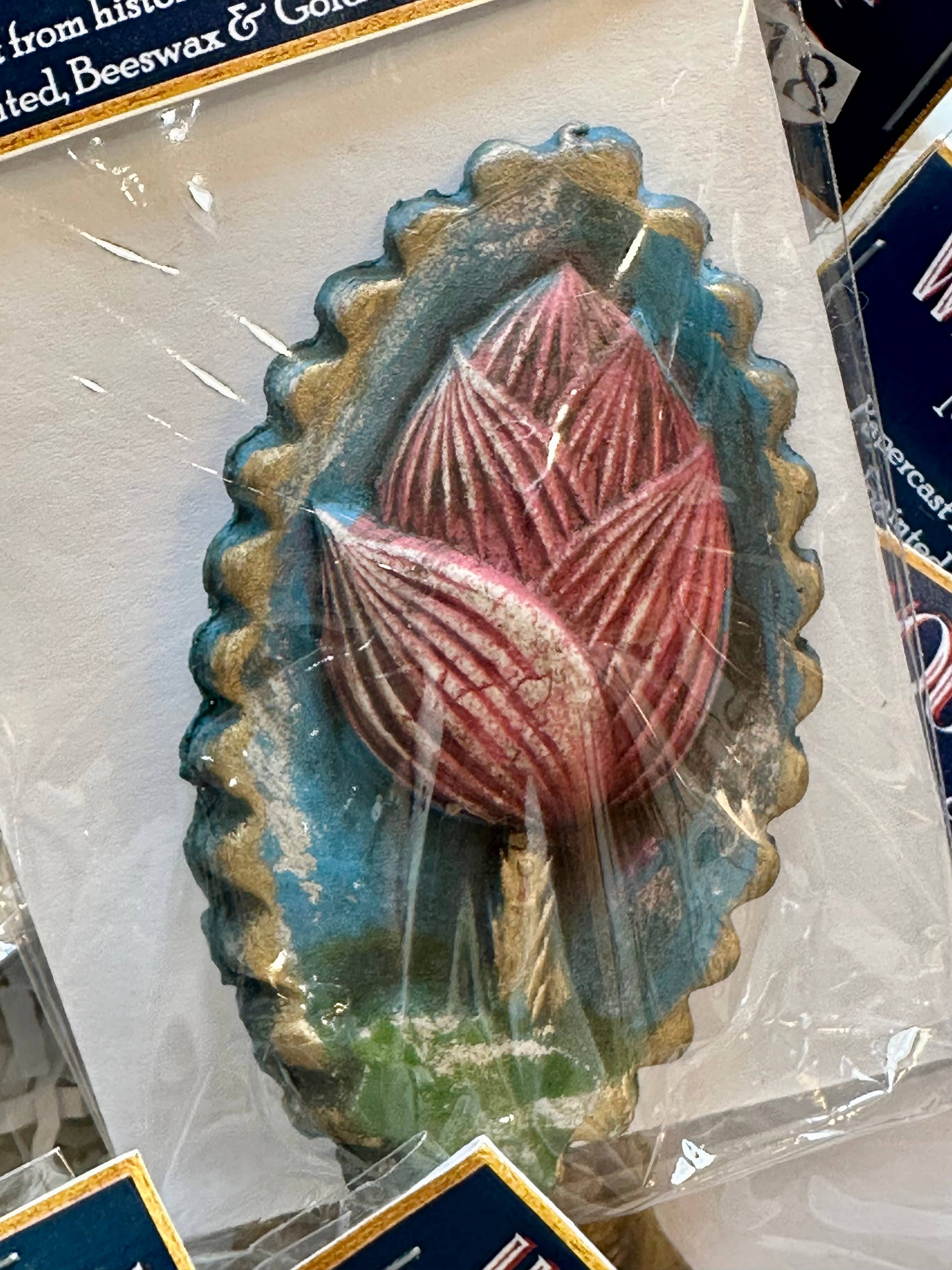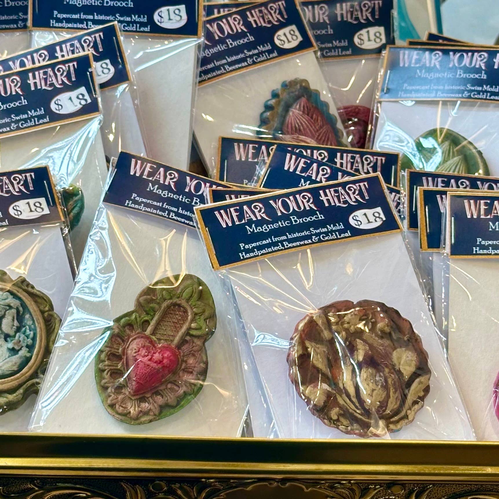 Prenda seu coração na manga de alguém e eles carregarão seu amor o ano todo. Nossos broches são delicadamente feitos a partir de papercasts moldados em formas históricas europeias para bolos. Pintados à mão e dourados, revestimos cada peça com uma cera de abelha de alta resina (não pegajosa) para garantir durabilidade. Há quatro designs únicos de coração, pintados em diversas cores e tratamentos de dourado, todos singulares. Os broches medem aproximadamente de 2,5 cm a 5 cm de altura e são muito resistentes. Nossa argila de papel reciclado, uma vez moldada e seca, forma uma peça rígida, forte e com detalhes finos. Pequenos ímãs de botão presos na parte de trás permitem usar o broche sem perfurar o tecido. Basta colocar a fina peça magnética atrás da blusa, lenço, etc., e o broche do outro lado — e voilà! Os ímãs seguram o broche firmemente. (E também funcionam como ímãs de geladeira!) O conjunto com 12 broches oferece uma variedade bem distribuída de estilos e cores, embalados individualmente em saquinhos de celofane re-seláveis.