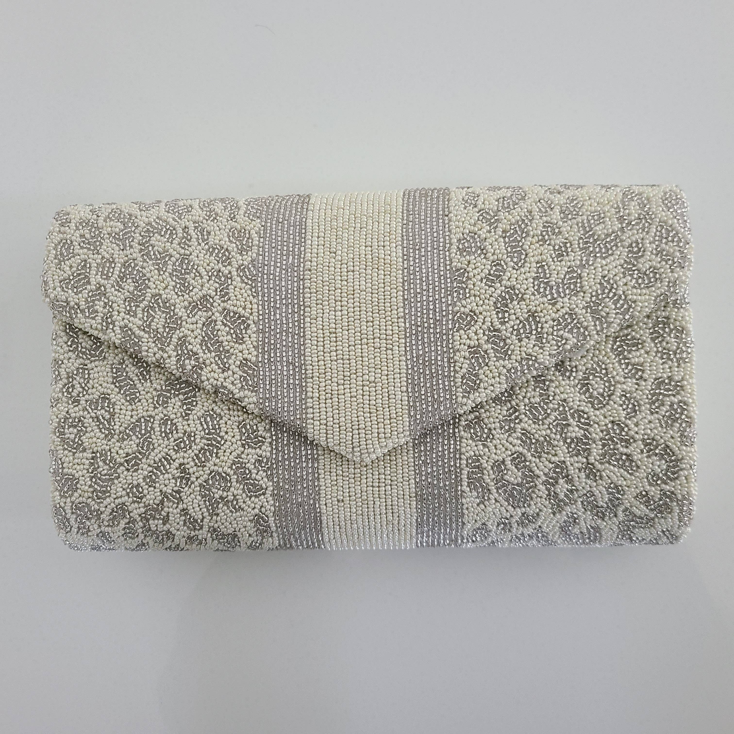 Bolsa com alça recortada totalmente frisada. Com uma corrente metálica. Este produto é 100% artesanal e com miçangas. Forro de cetim luxuoso, feito com um pequeno bolso interior para cartões e outros objetos de valor.