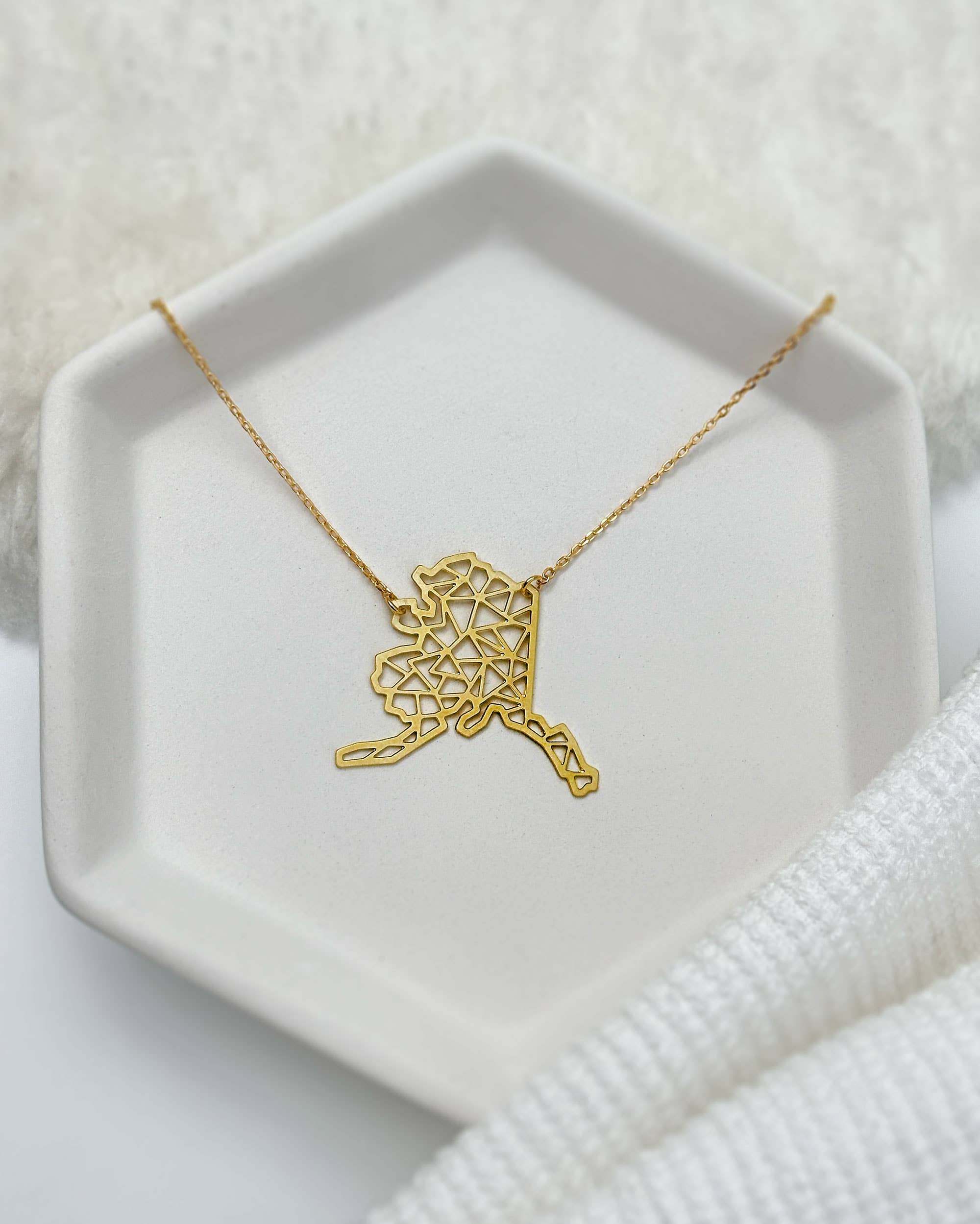 Abrace o encanto da Terra das Luzes do Norte com os nossos brincos do estado do Alasca. Com um estilo geométrico, estas peças pendem de fios curtos ou longos, tornando-se um acessório minimalista adequado para qualquer roupa. Perfeito como um presente sincero, este design original permite que qualquer pessoa leve consigo um pedaço da Última Fronteira, servindo como uma lembrança da deslumbrante beleza natural e vasta natureza selvagem do Alasca. O pendente do estado do Alasca, um design original da joalharia A Tea Leaf, é feito de latão cru fino, delicado e leve, sendo isento de níquel e chumbo. As suas dimensões são de 1 3/8 x 1 1/4 polegadas, oferecendo um tamanho refinado que é perfeito para o uso diário e versátil. Os fios dos brincos são banhados a ouro e também são isentos de níquel e chumbo, tornando-os perfeitos para a maioria dos tipos de pele sensível. Existem duas opções de comprimento para os fios: os curtos, onde os pendentes ficam logo abaixo da orelha, ou os longos, para um efeito mais alongado. Os brincos vêm num cartão.
