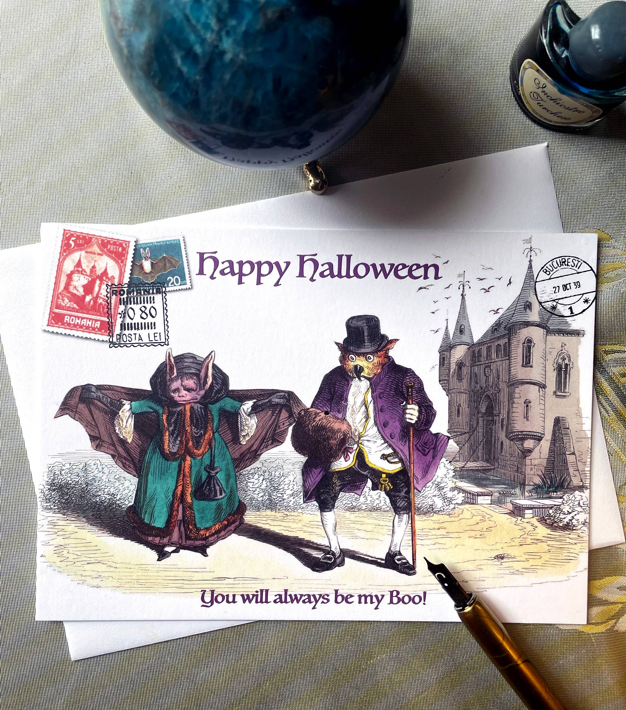 Natal no Floresta Negra! Diga "Feliz Natal" à moda alemã com um cartão de recordação de férias de 2025 "Frohe Weihnachten" com texto estampado em folha de ouro. Um veado malhado passeia pela floresta, parando sob luzes coloridas de Natal. A estampagem luxuosa em folha de ouro, o acabamento aveludado mate e o papel extra grosso tornam este cartão de 5" x 7" uma recordação a estimar. Inclui envelope branco A7 com aba em V com cada cartão. Capa compostável. Coleção Natal 2025 Feito e desenhado nos EUA.