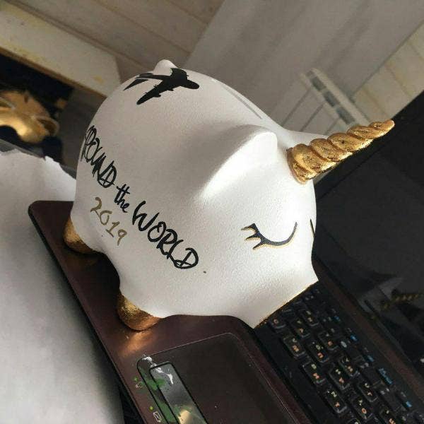 Cofrinho feito à mão e pintado à mão, feito de material ecológico (gesso). Dimensão: 5,3 “x 3,7" x 4,5".