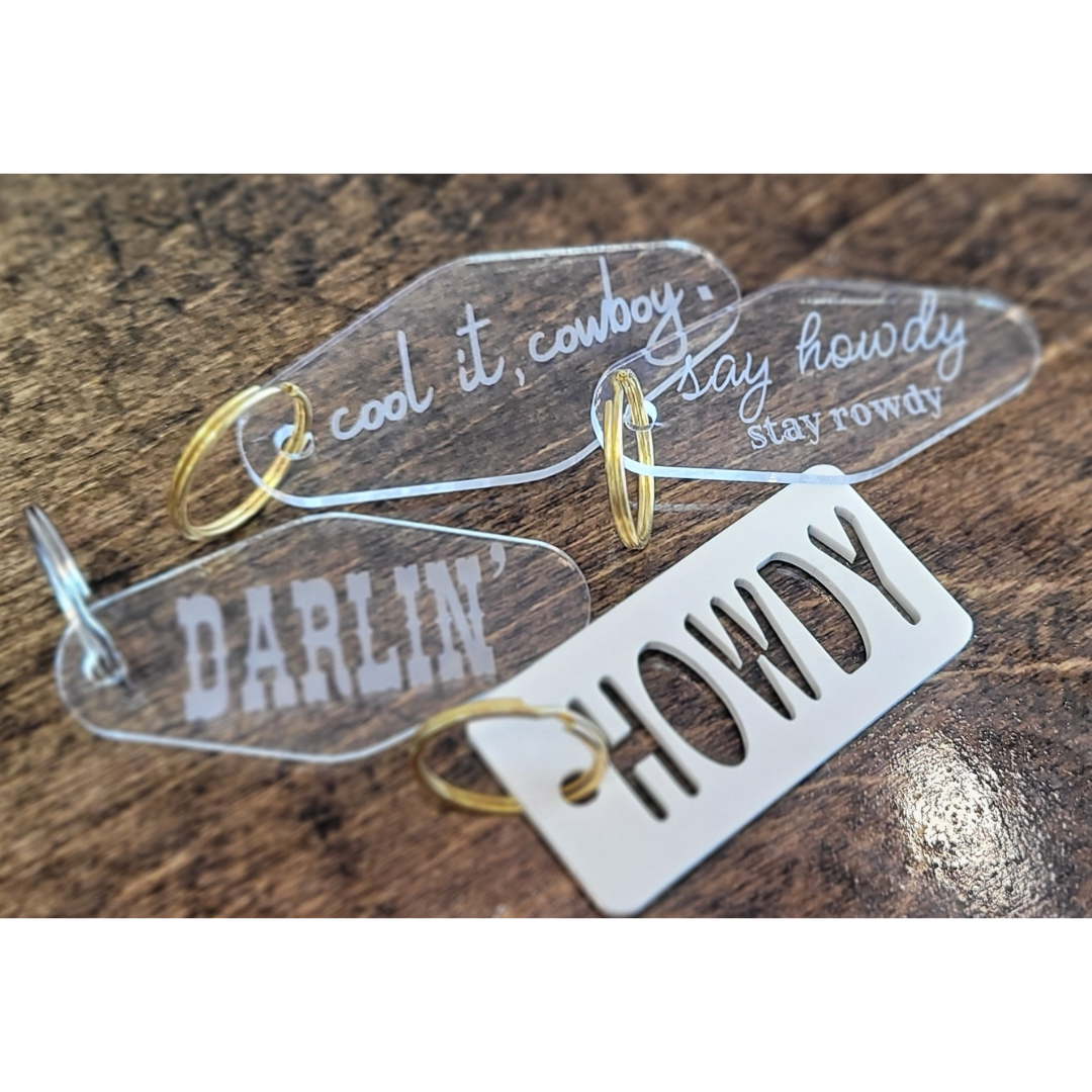Porta-chaves de motel minimalista de estilo ocidental Darlin'. Feito de acrílico durável. Vem com a sua escolha de porta-chaves prateado ou dourado. *TODOS OS PORTA-CHAVES VÊM DESTACADOS PARA EVITAR DANOS DURANTE O ENVIO* Todos os meus produtos são feitos à mão e embalados por mim. Estou tão feliz que esteja a fazer compras pequenas! Obrigado por me apoiarem a mim e à minha pequena empresa. -Taylor, bétula e barbante