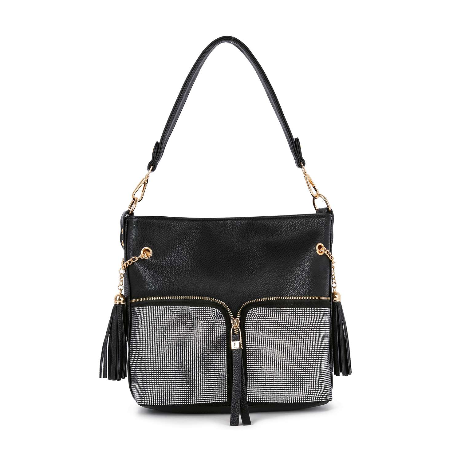 Gire algumas cabeças! Um brilhante padrão em forma de diamante cobre o painel dianteiro desta fenda cruzada. * 1 bolso traseiro com fecho de correr. * 1 bolso frontal com fecho de correr. * Alça ajustável 22L. * Pele sintética com interior forrado. * 2 bolsos interiores deslizantes e 1 bolso com fecho de correr. * Fecho zip superior. * Ferragens em prata. Tamanho aproximado: 9.5L x 11A x 1.5W Modelo: BHD-2331
