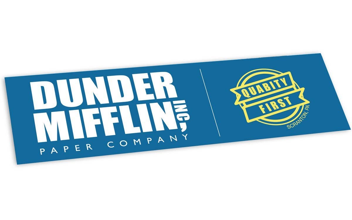 O logotipo da Dunder Mifflin Paper Company é uma imagem icónica dentro da cultura pop americana — e por boas razões. Qualquer fã do programa de sucesso da NBC “The Office” precisa deste autocolante! Resistentes à água e às intempéries, estes autocolantes cortados beijos são um ótimo item decorativo para garrafas de água, computador portátil, equipamento de exterior e muito mais. Especificações do produto - Tamanho do autocolante: 1.75-3" — depende do design do adesivo - Tamanho da folha de fundo: 3 x 4