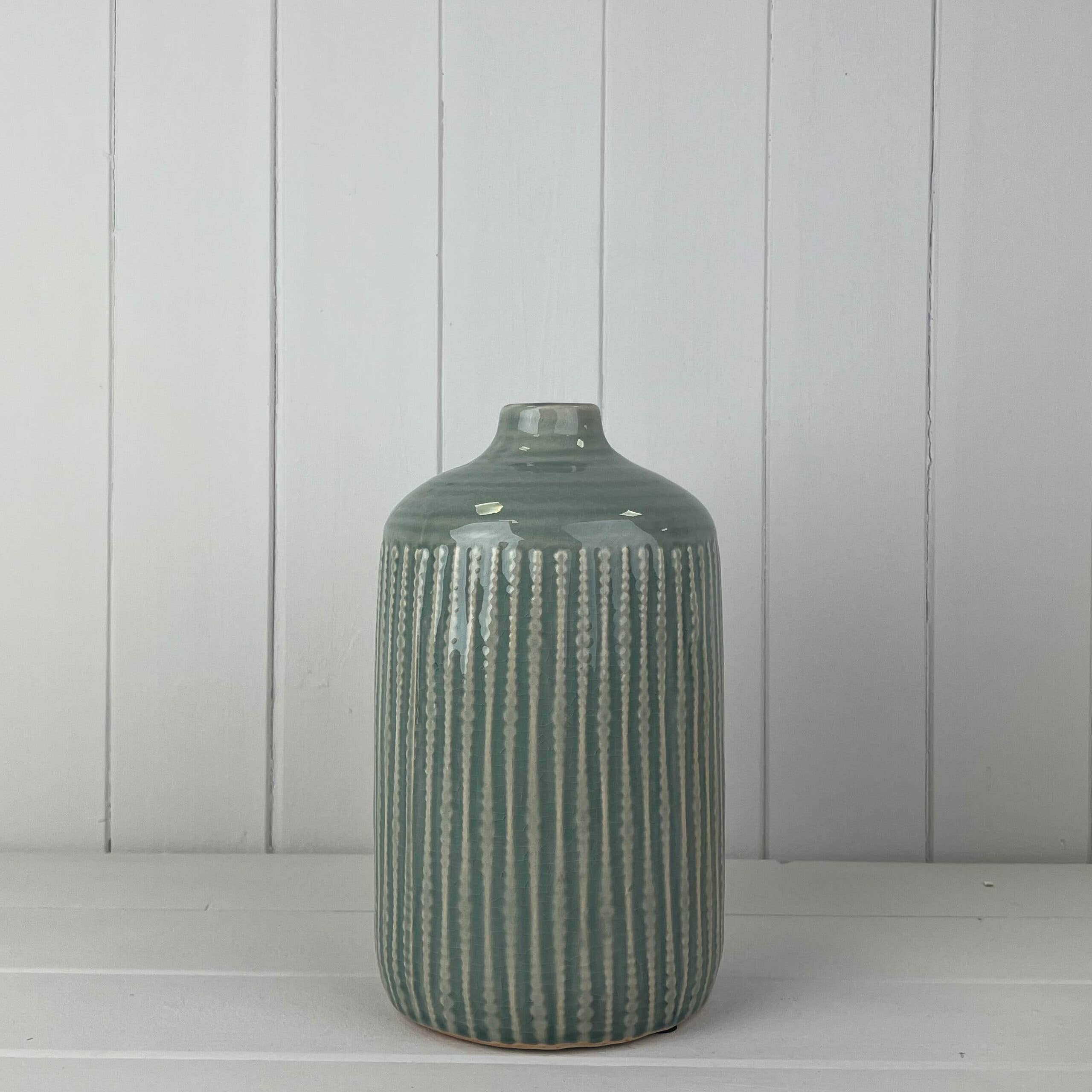 Os vasos de vidro canelado são de ótima qualidade e ficam ótimos na loja.