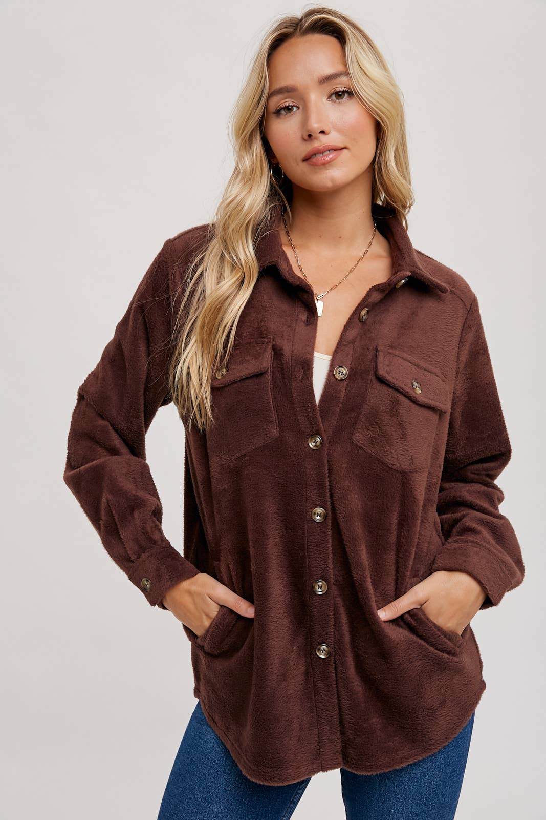 Manilha de tecido com um tecido de terry francês escovado, botão na frente, decote com colarinho, bolso com aba no peito, mangas dolman caídas, detalhes de corte de borda bruta, silhueta desleixada. Use-o sozinho como uma camisa ou camada sobre sua blusa favorita como uma jaqueta fofa. -A modelo tem 5'9" e vestindo um pequeno