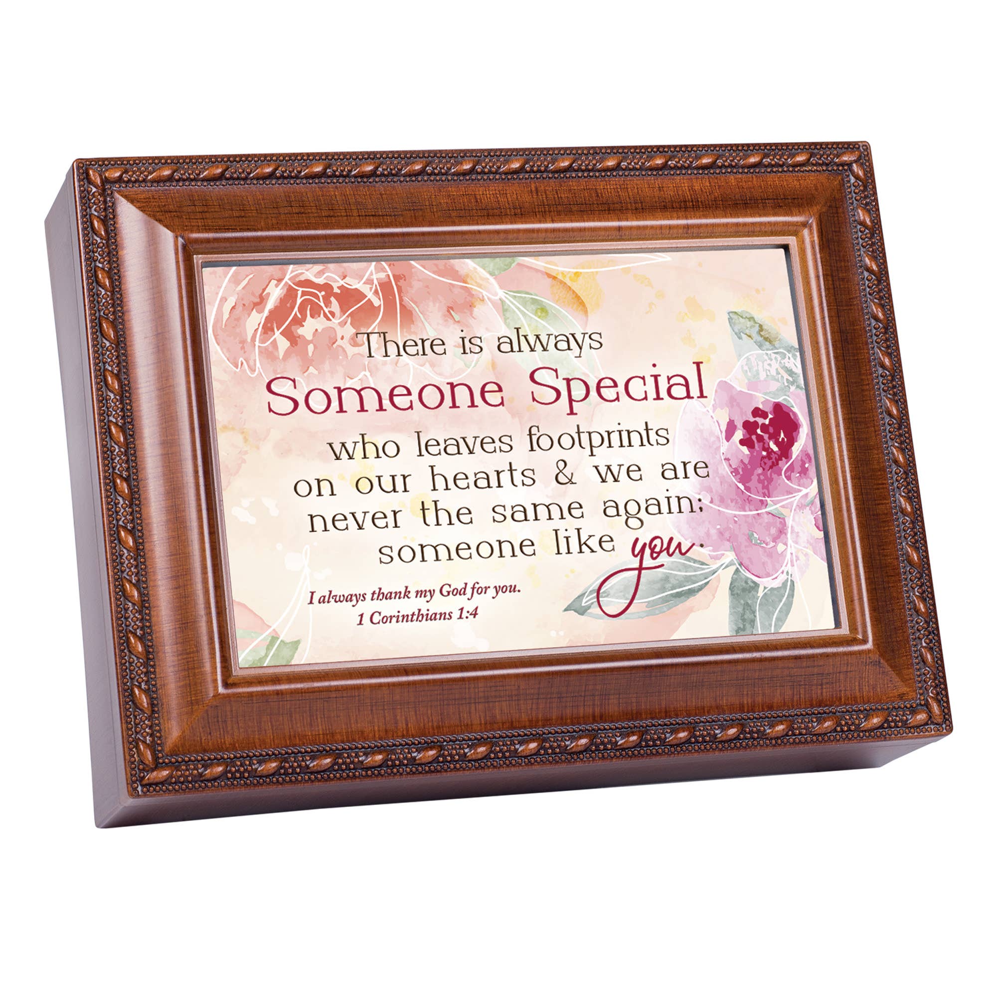 Esta caixa de manobra musical abriga lindamente pequenos tesouros e memórias. Apresenta um acabamento em tom de madeira tradicional e aro frisado ornamentado. A tampa articulada também é uma moldura de fotos; vem com uma impressão de arte adorável, sob vidro, que lê: Nora - Você tem sido uma alegria na nossa vida. Estamos tão felizes por tê-lo como membro da nossa família; Também Números 6:24: Que o Senhor o abençoe & Mantenha-o. O Art Print pode ser trocado para uma foto favorita 6x4; a parte traseira removível debaixo da tampa facilita. A caixa interior é um compartimento pequeno com tampo de vidro claro que mostra o movimento musical de Sankyo de alta qualidade. Quando a tecla sob a caixa estiver ferida, a música será reproduzida quando a tampa estiver aberta e parar quando estiver fechada. Toca a Canção: Que Grande Tu Arte. Compartimento de armazenamento tem um luxuoso forro aveludado preto. As pernas decorativas em tom prateado na parte inferior são acolchoadas para proteger o mobiliário. A caixa é feita de um polímero super-resistente que resiste a fissurar e a chipping. Tamanho geral é 8 x 6 x 2 5/8.