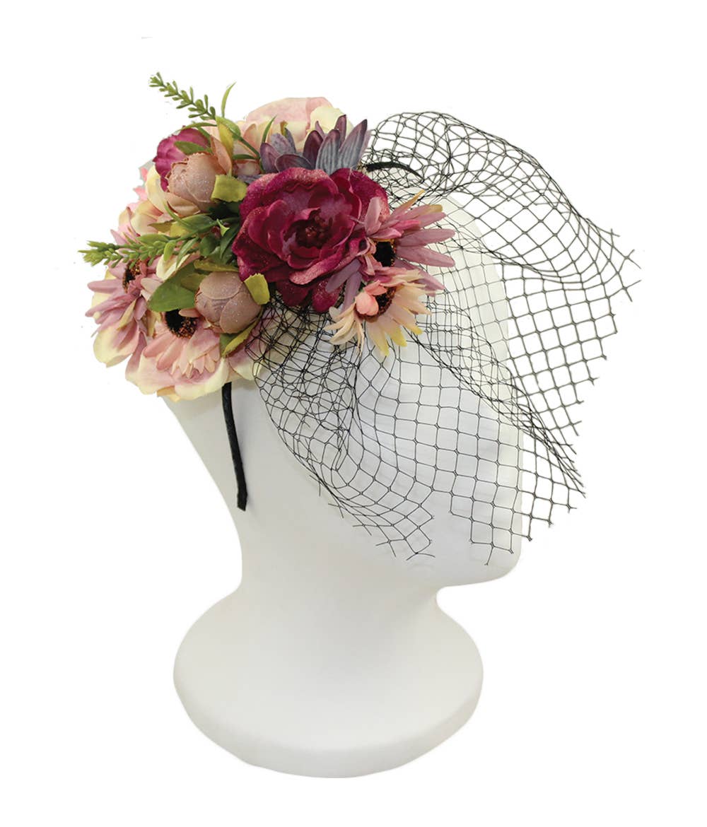 Tiara Fascinator 4848 com flor de poliéster e rede preta