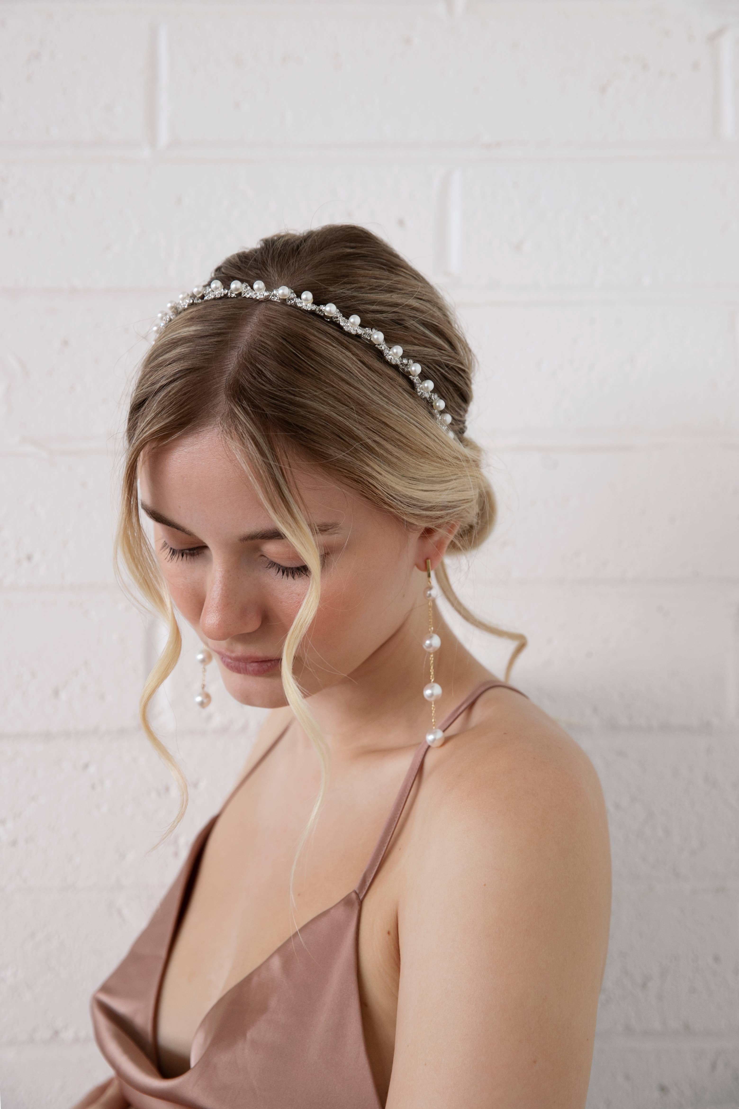 Uma linda e simples coroa inspirada em art déco é perfeita para o dia do seu casamento ou evento especial. Esta peça é feita de cristais Swarovski genuínos que são colocados à mão e agrupados. A peça está em uma coroa de fio de ouro flexível que pode ser usada de várias maneiras (como uma faixa de cabeça tradicional ou tecida em todo o seu penteado). Feito à mão em nosso estúdio no sul da Califórnia.