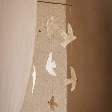 Estes móbiles são perfeitamente equilibrados para um movimento muito gracioso. Puxe e solte o cordão inferior para vê-los voar. Cada peça é feita de fibras de densidade média, pintada à mão com tinta acrílica atóxica, e decorada com nozes de tagua tingidas. Ideal para uso em ambientes internos, em qualquer cômodo da casa. Se for pendurado do lado de fora, mantenha protegido da chuva. Estas delicadas peças são feitas à mão por uma empresa colombiana de propriedade feminina e embaladas em caixas personalizadas por outra empresa de propriedade feminina em Chicago. Envergadura: 25,4 cm. MANTENHA FORA DO ALCANCE DE CRIANÇAS COM 3 ANOS OU MENOS.