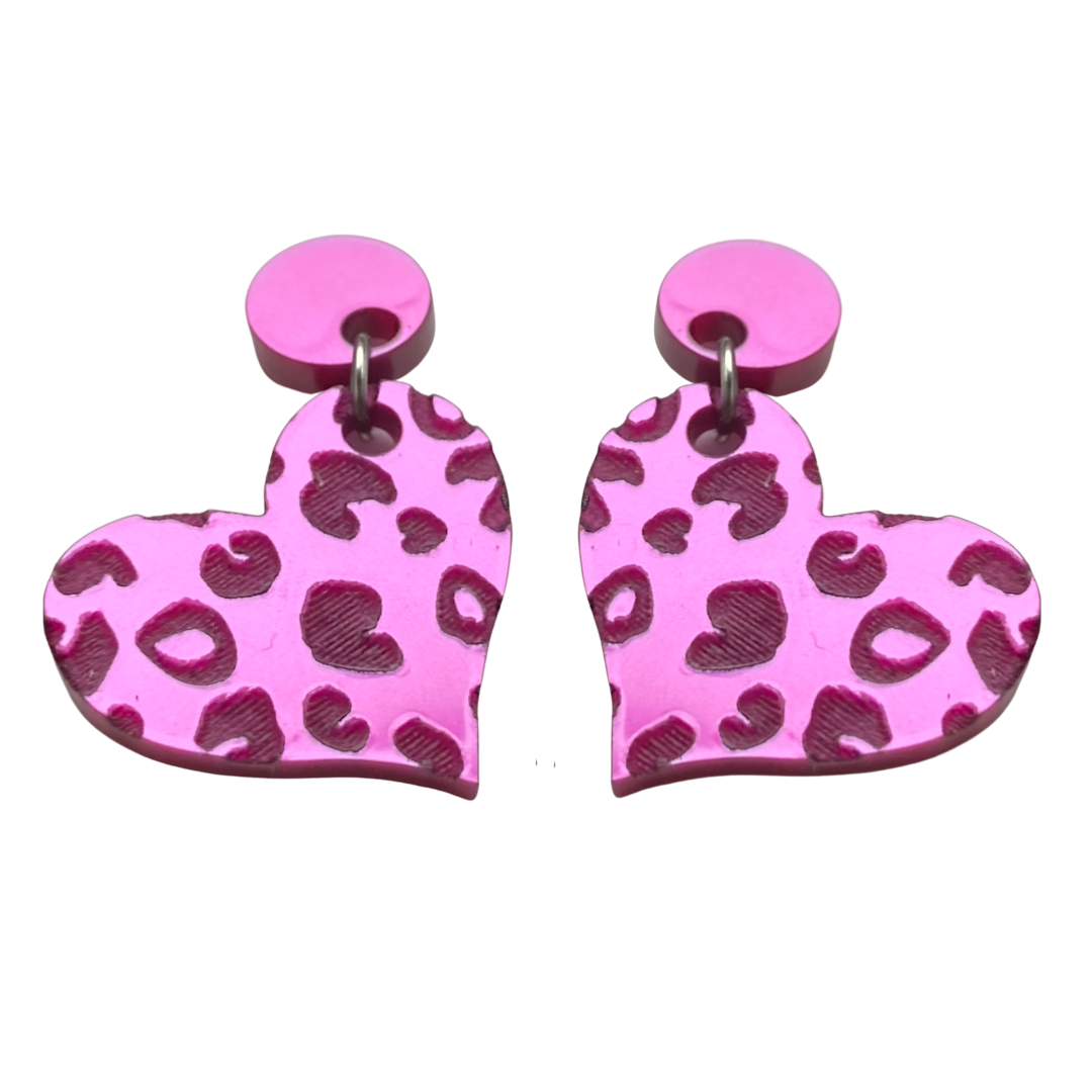 Esses corações de leopardo brilhantes parecem muito melhores pessoalmente!!! Eles são alguns dos nossos favoritos nesta coleção. Eles são cortados em acrílico prateado leve e o padrão leopardo é gravado a laser. Eles são tão leves que você mal saberá que eles estão lá!! Os postes são de aço inoxidável cirúrgico com um suporte de borracha para mantê-los no lugar. Há um brinco direito e um brinco esquerdo para que ambos fiquem pendurados nas orelhas. O comprimento total mede 1 3/4”
