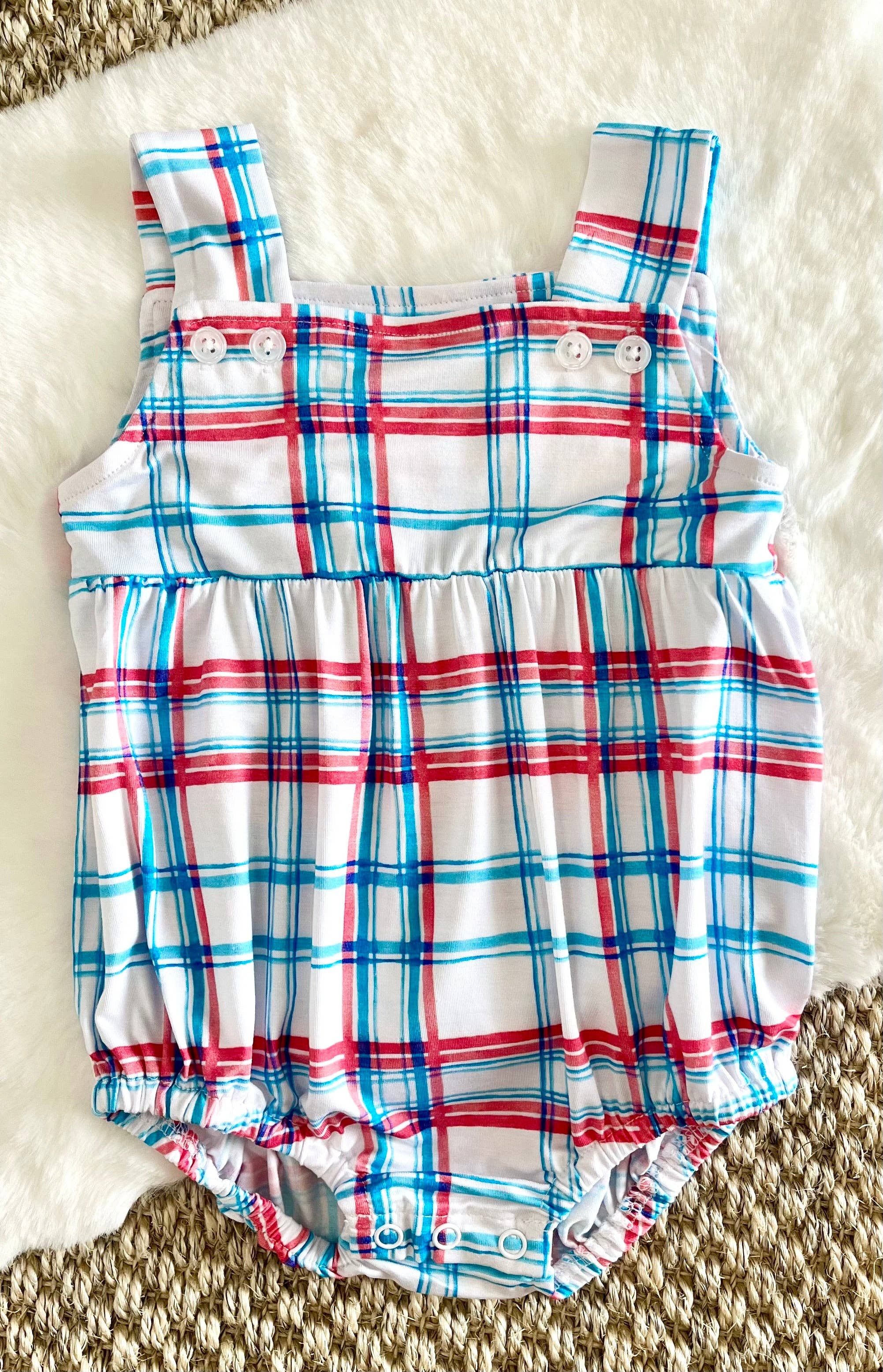 * Design aquarela xadrez azul/vermelho * Feito de tecido macio e elástico 95% viscose de bambu, 5% elastano * Zíper duplo para trocas de fraldas de fácil acesso * Sem etiqueta para peles delicadas * Opção de calçado dobrável para roupa de dormir * Luvas de mão dobráveis para evitar arranhões * Para a segurança da criança, a roupa de dormir deve caber confortavelmente * Funciona grande, tamanho reduzido para um ajuste confortável