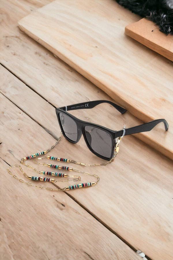 Acessório de corrente decorativa com contas de vidro para óculos de sol, óculos de grau e máscara. A cor e a qualidade do produto podem variar ligeiramente do que é exibido na tela devido às condições de iluminação da fotografia e à calibração individual da cor do monitor. Para mais informações sobre o produto, entre em contato com Andrea Bijoux. Contas de vidro, corrente para máscara, corrente para óculos de sol, acessório para óculos.