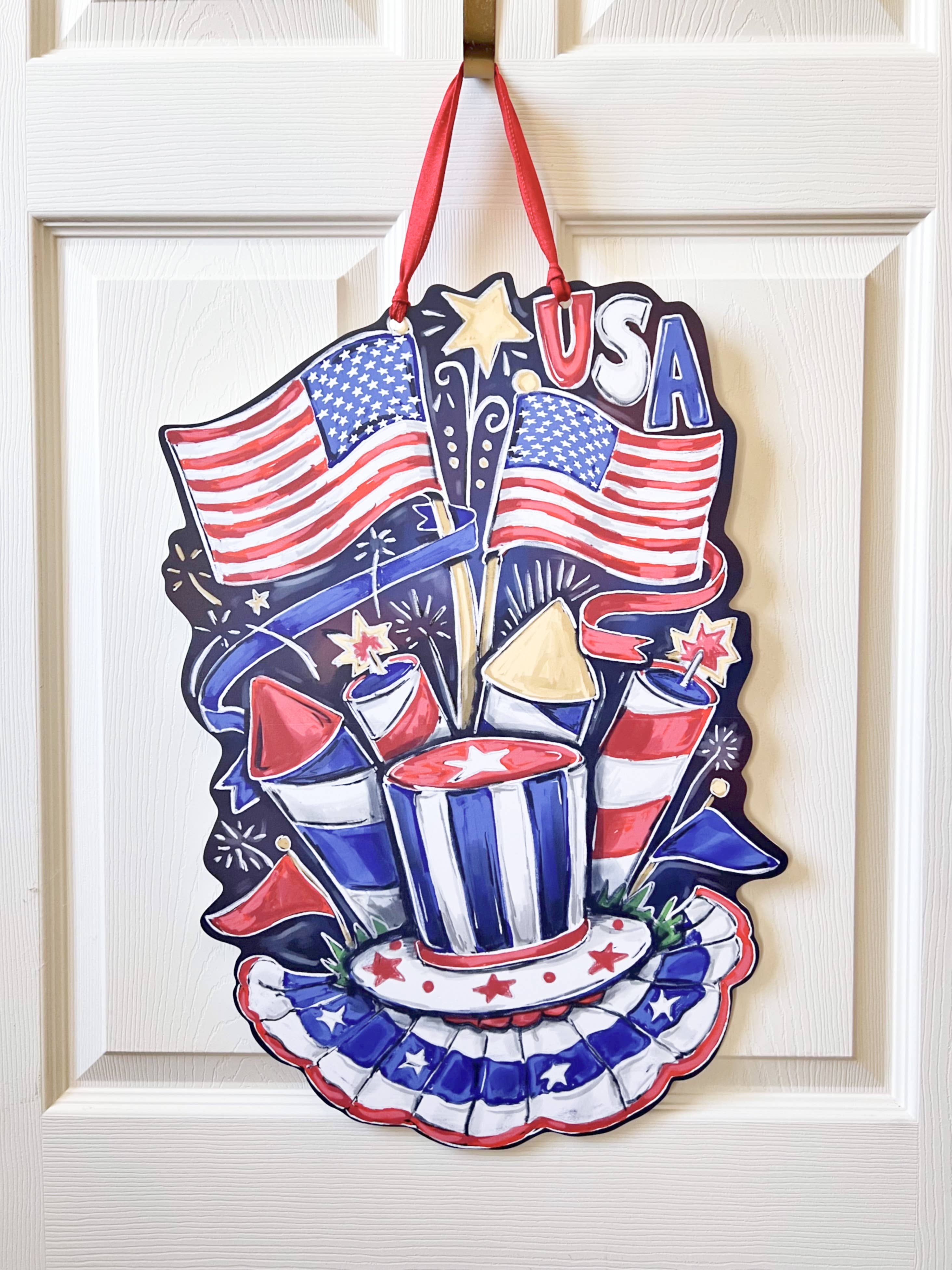 Mostre seu espírito patriótico para os EUA com este cabide de porta com bandeira americana. Impressão à prova d'água e à prova de desbotamento da pintura digital da nova artista de Orleans Kristin Malone. Vem com uma fita pendurada. Mede 13,54 “de altura (cerca de 18" de altura total quando pendurado por fita) x 20" de largura x 1/4" de espessura. Pode ser exibido em ambientes internos e externos. Projetado e produzido em Nova Orleans, La. Observe que quaisquer mudanças extremas na temperatura podem fazer com que este suporte da porta se deforme. Isso inclui temperaturas abaixo de zero e temperaturas de calor anormalmente altas. Ou seja, se você tiver uma porta de metal sob a luz solar direta durante o verão, o calor excessivo pode fazer com que o plástico se deforme.