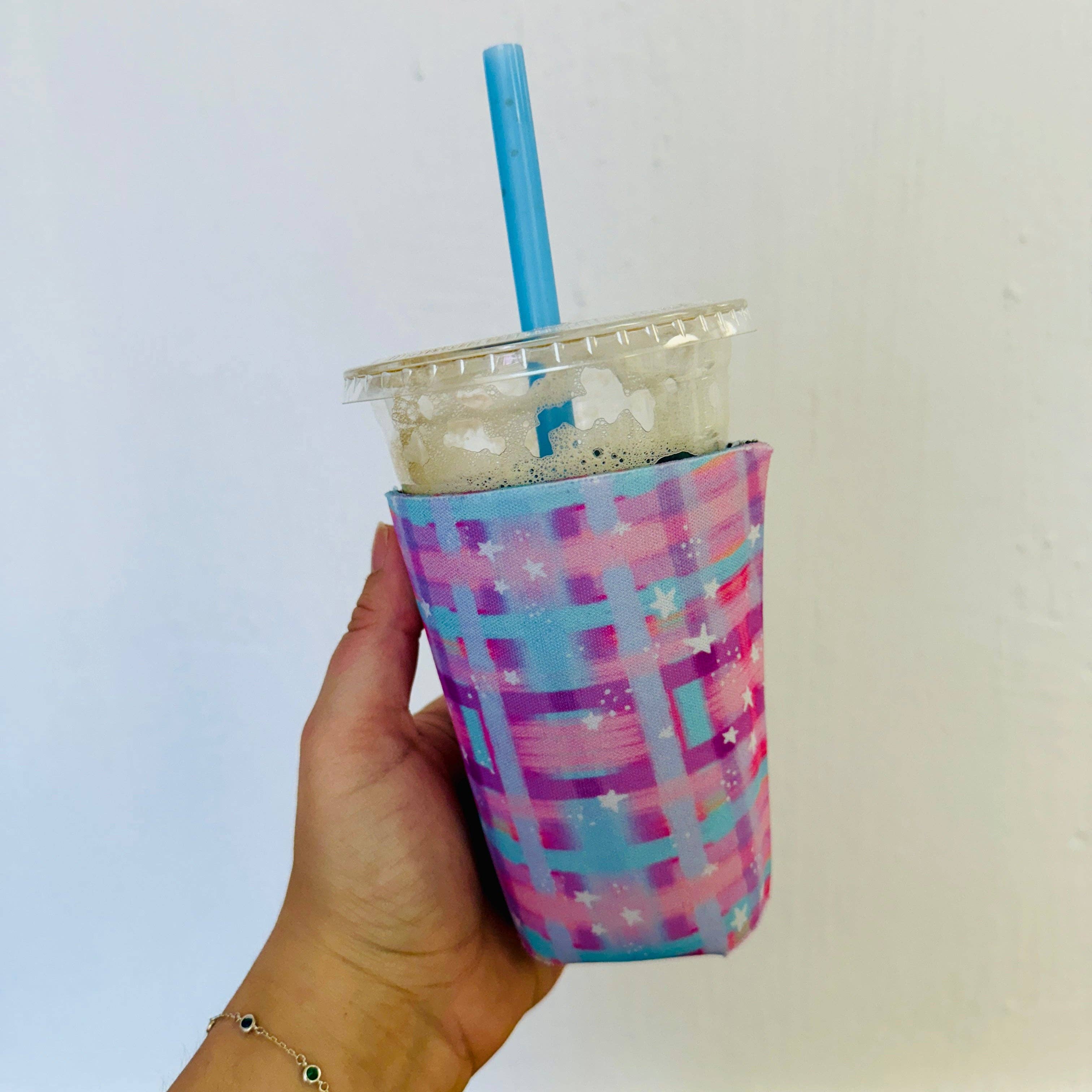 Copo slim de parede dupla em aço inoxidável branco 600 ml com padrão rosa e fita