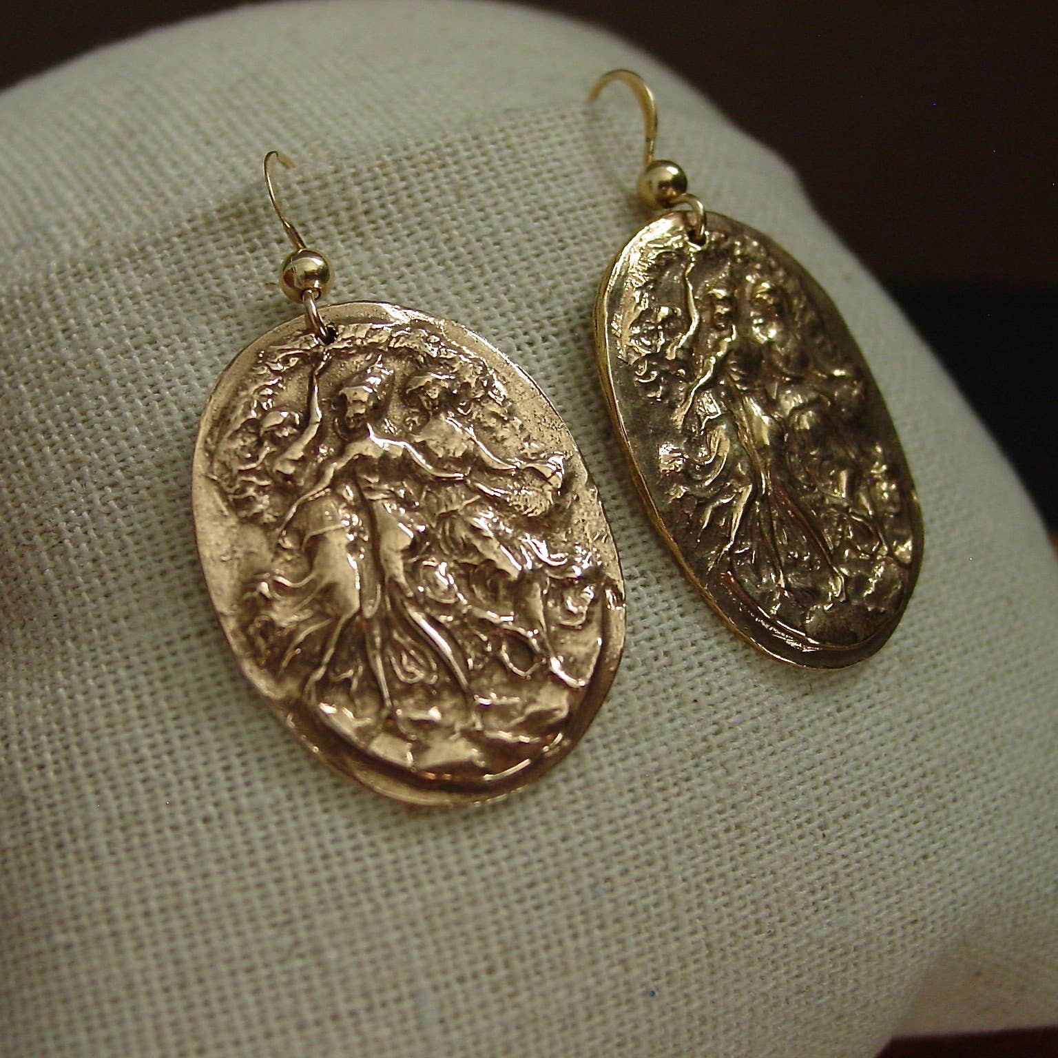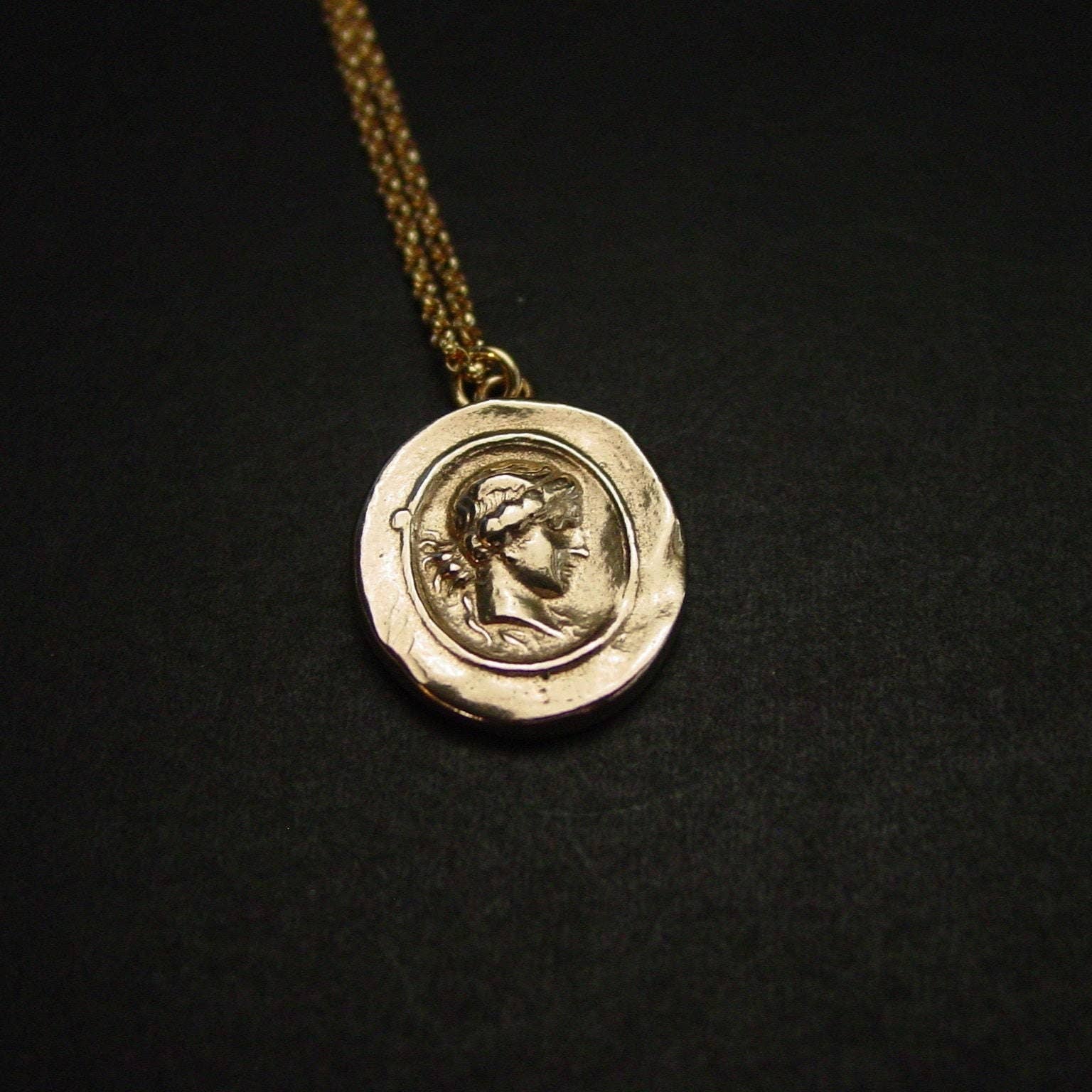 Reprodução artesanal em talhe doce do século XVII representando o Deus Hermes com sua família composta pela deusa Afrodite e seu filho Hermafrodito. Hermes ou Mercúrio é o deus das fronteiras, oradores, estradas e viajantes, ladrões, atletas, pastores, comércio, velocidade, astúcia, sono, um condutor de almas para a vida após a morte e mensageiro divino. Afrodite ou Vênus é a deusa do amor, beleza, prazer, paixão e procriação. - Reprodução de camafeu artesanal - Bronze amarelo sólido, também chamado de pingente de bronze dourado de joalheiro - Corrente cheia de ouro 14k - Livre de níquel