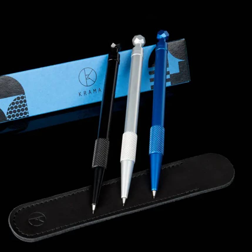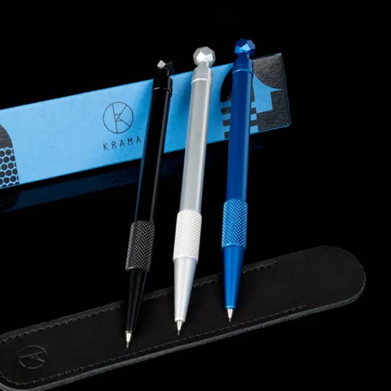 A lapiseira Push Action foi projetada para acomodar uma ponta de lápis de 0,5 MM ou 0,7 MM. O corpo de alumínio sólido é realmente leve. A seção de empunhadura serrilhada oferece uma ergonomia perfeita e uma experiência verdadeiramente tátil. A parte superior facetada do botão ajuda a acomodar e reabastecer as pontas do lápis. O objetivo inicial foi reproduzir a sensação de manusear um instrumento de precisão bem feito. O lápis é o primeiro instrumento de escrita do KRAMA com um corpo redondo em vez de hexagonal. Uma peça cativante de engenharia, fresada com precisão, ultrapassando os limites do que uma fresadora pode fazer. Depois de processado para obter seu acabamento perfeito, ele é pacientemente montado e finalizado à mão. A lapiseira KRAMA Push Action é uma companheira de escrita compacta e impressionante, tradicional e ao mesmo tempo moderna. É preciso, duradouro e durável. É confortável quando nós