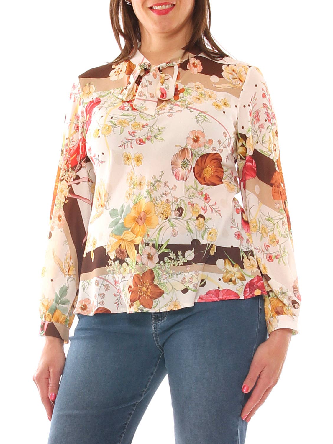 Kaftan para mulheres curvy em georgette com estampa abstrata, mangas kimono, decote barco com abertura em gota e botão com detalhe de joia. Forro em jersey stretch de cor lisa. Composição: 30% viscose, 30% poliéster, 30% poliamida, 10% elastano. Instruções de lavagem: lavagem a 30 °C. Produto feito na Itália. Modelo mede 1,78 m e veste tamanho L.