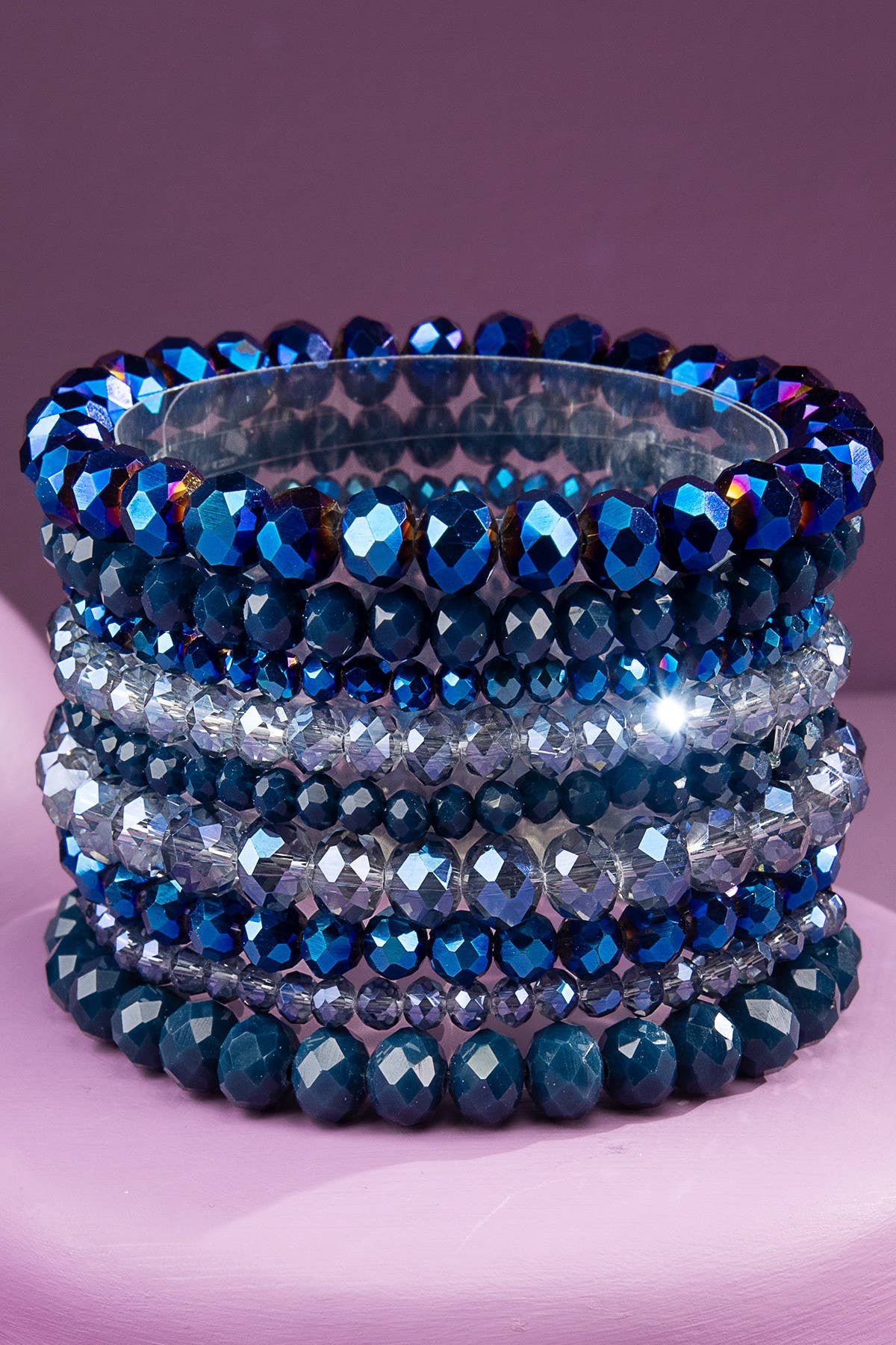 Um trio elegante de pulseiras elásticas com contas de vidro facetadas, projetadas para fácil sobreposição ou brilho individual. Cada pulseira oferece uma mistura de brilho e cor que eleva qualquer conjunto. *Contas de Vidro *Conforme com Níquel/Chumbo *APROX. C 8" D 2" 0,82oz. *Importado