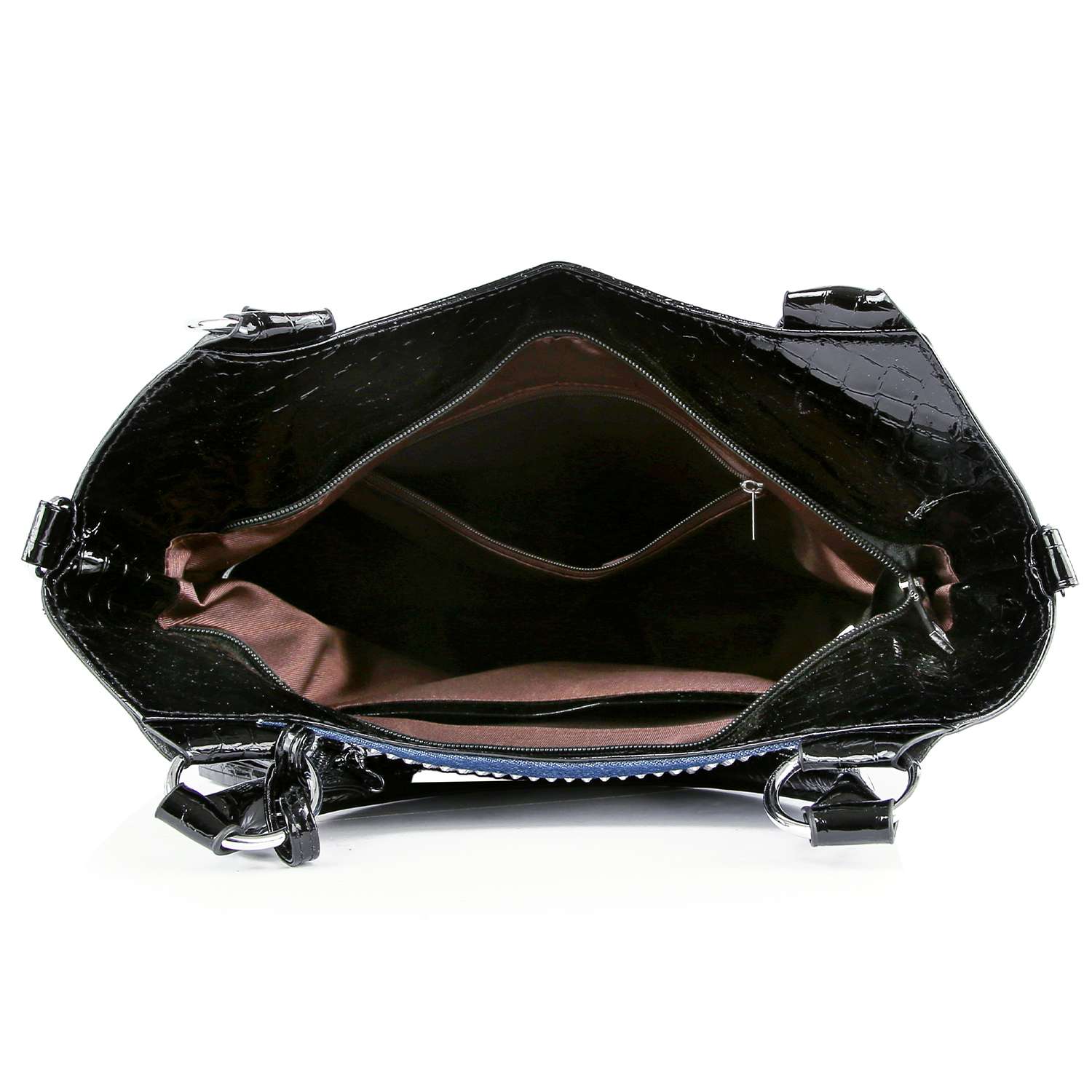 Adicione uma dose séria de brilho ao seu visual diário com esta linda bolsa de mão. * 1 bolso traseiro com fecho de correr. * Pegas duplas de 8L; alça destacável 22L. * Pele sintética com interior forrado. * 2 bolsos interiores deslizantes e 1 bolso com fecho de correr. * Fecho zip superior. * Ferragens em prata. * Inclui uma bolsa de moedas em pulseira a combinar; 5,5L x 4H. * Compatível com tablet (tamanho std. 8-10in). Tamanho aproximado: 15L x 12H x 4.5W Modelo #: BHD-6151