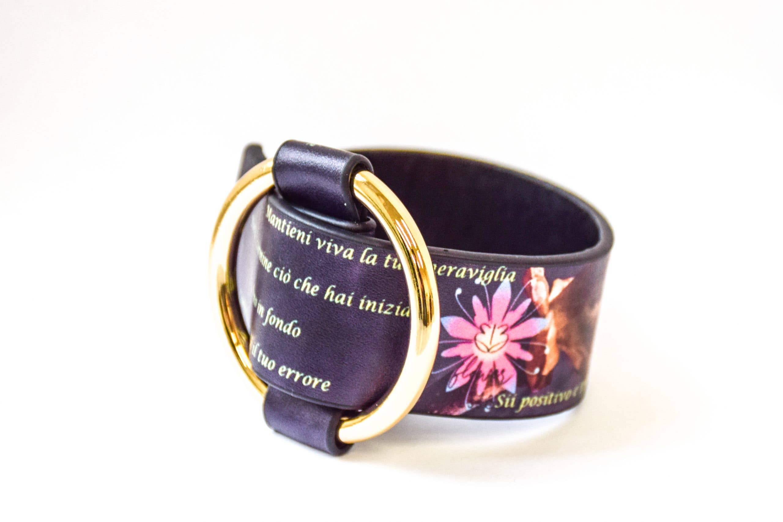 Pulseira em couro ecológico (couro PU) com impressão digital (design BB Flower que pode ser coordenado com os outros acessórios) - fecho ajustável com anel de latão polido. Comprimento 25 cm x altura 2,5 cm. Perfeito para looks casuais ou formais, dá um toque de afirmação pela coordenação com os outros BB ACCESSORIES. Com uma pulseira BB, você não poderá passar despercebido. Pulseira de couro ecológico combinável com todos os outros acessórios BB Flower - nosso design mostra palavras/frases de motivação em italiano