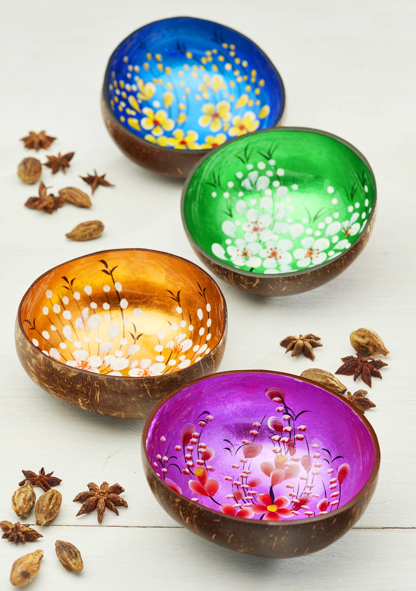 As cascas de coco que sobraram da produção de alimentos são transformadas em tigelas sustentáveis e ecológicas. Os interiores das taças coloridas são pintados à mão com um design em flor de cerejeira em cores de acabamento metálico. Cada um é lindamente completado em um atraente brilho claro, contrastando soberbamente com as fibras orgânicas da casca exterior suavizada. Dramáticos e atraentes, os ricos esquemas de design adaptam-se à luz, criando dimensões de cores interessantes. Nas cores azul, rosa e prata. 14 x 14 x 6cm Coco Adequado para alimentos secos Lavar apenas à mão Estes belos artesanatos são da casa de antigos templos e pagodes no norte do Vietname. O nosso fornecedor está empenhado em produzir produtos tradicionais e culturais que ainda têm um lugar na sociedade moderna. Projetos pensativos são criados a partir de materiais ecológicos e sustentáveis, refletindo a experiência de artesãos vietnamitas situados em um centro histórico para o budismo.