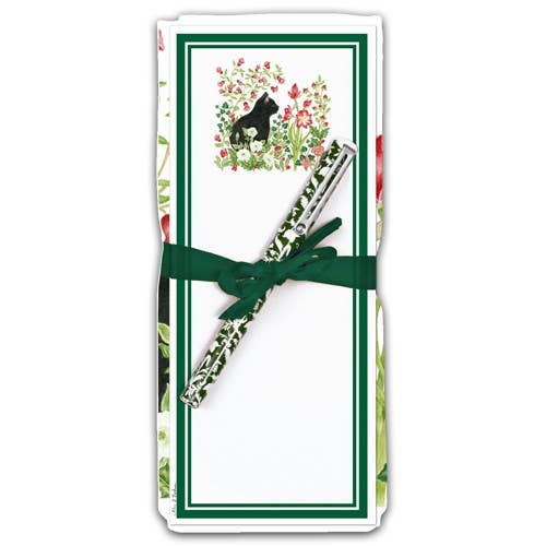 Este conjunto contém uma toalha de saco de farinha 100% algodão de 24" x 38", um bloco de notas magnético correspondente (3 ½” x 8 ½”) (embalado em violoncelo transparente) e caneta. A toalha é dobrada para que o desenho fique visível e todo o conjunto está bem amarrado com uma fita. A toalha é lavável na máquina.