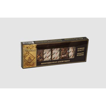Nougat macio de amêndoas coberto com uma fina camada de chocolate amargo, rico em frutas secas à vista e muito delicado no paladar, predominando os aromas típicos de mel suave.