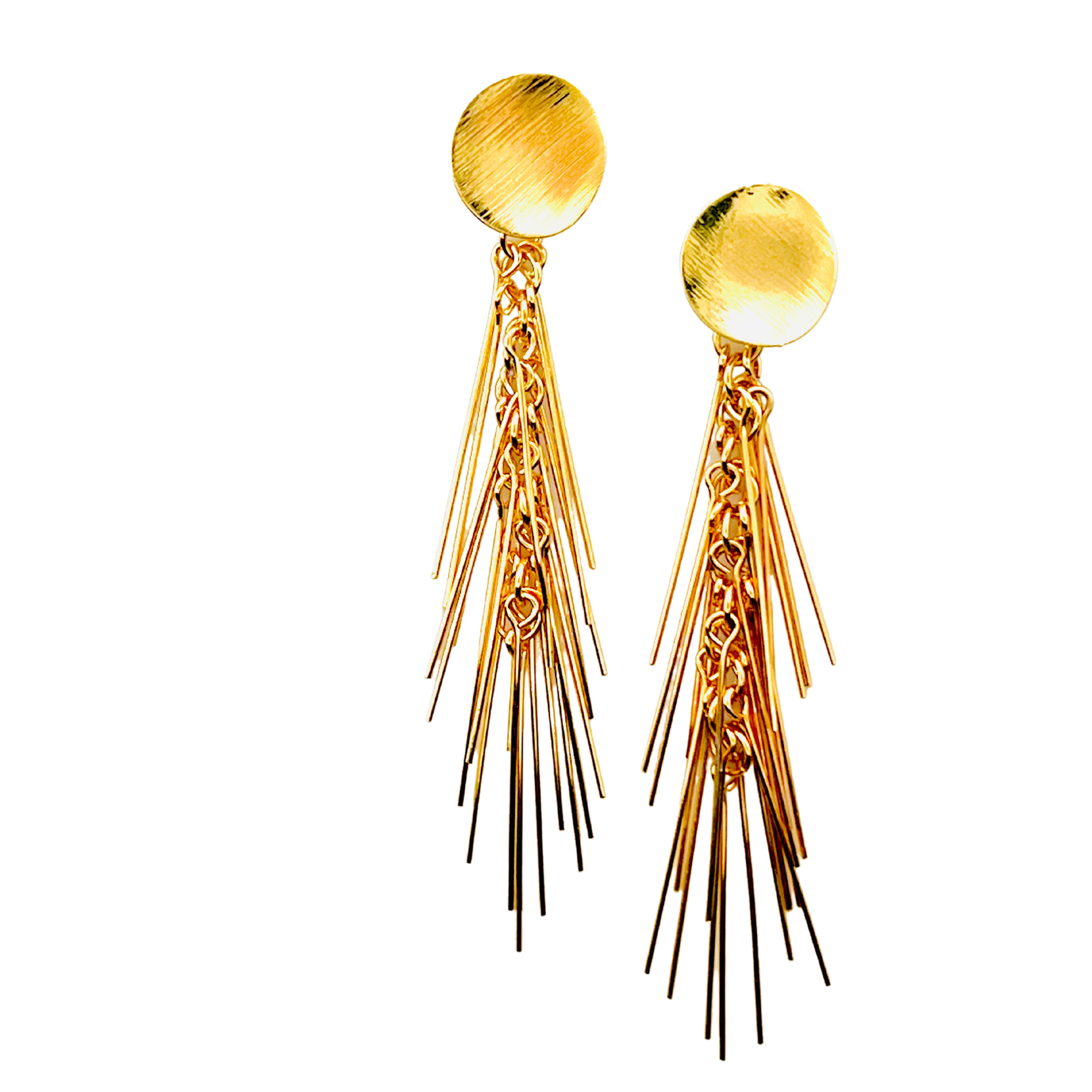 Brincos banhados a ouro 18k com discos madrepérola têm 1 1/4 polegadas de comprimento. Têm um acabamento areado e pós-costas.