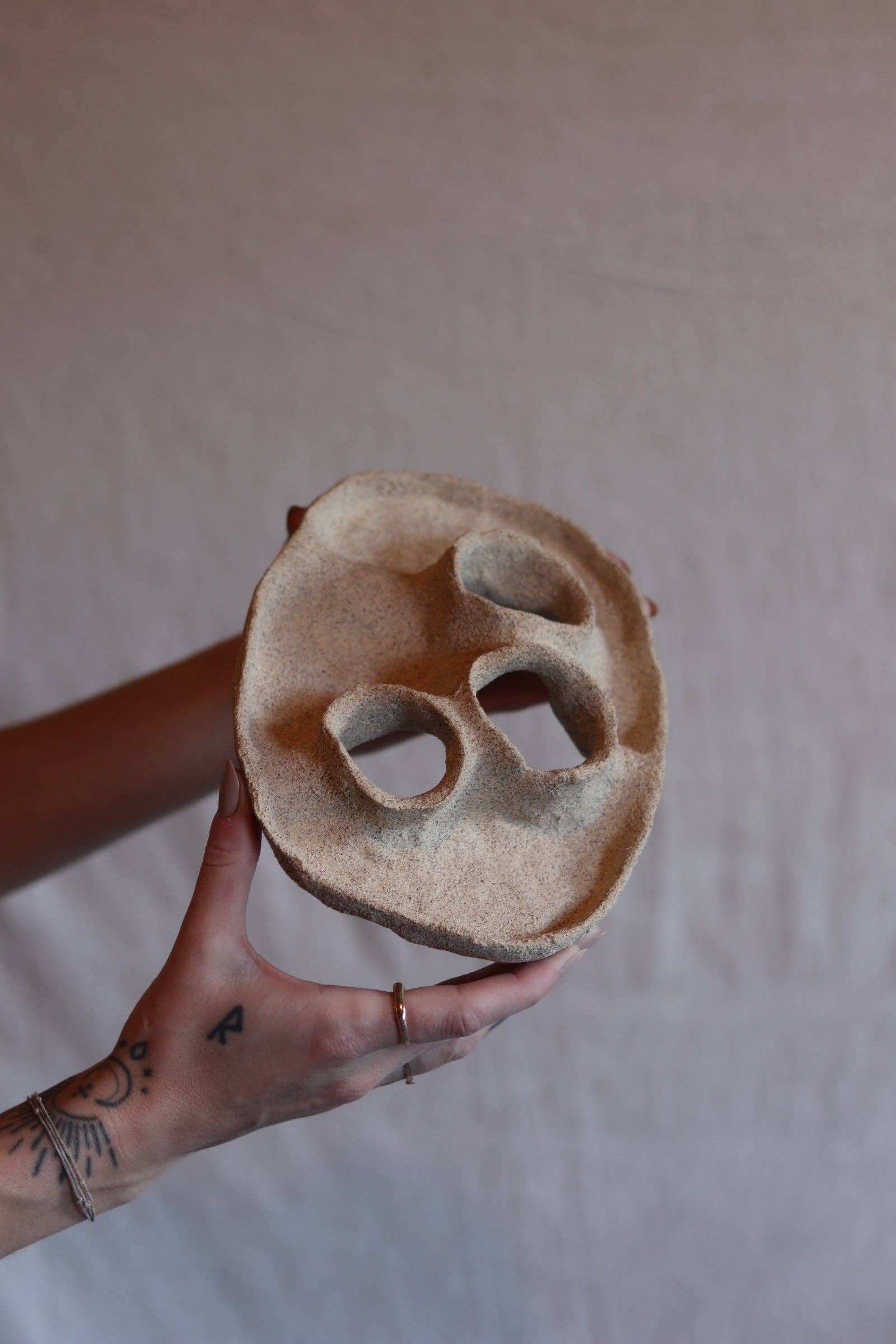 Prato feito à mão foi criado usando uma mistura manual de argilas e materiais terrestres recolhidos. Esta peça foi deixada crua e sem vidrado, destacando a beleza dos materiais. As imperfeições subtis conferem a esta peça uma presença. comprimento aproximado: 15 cm