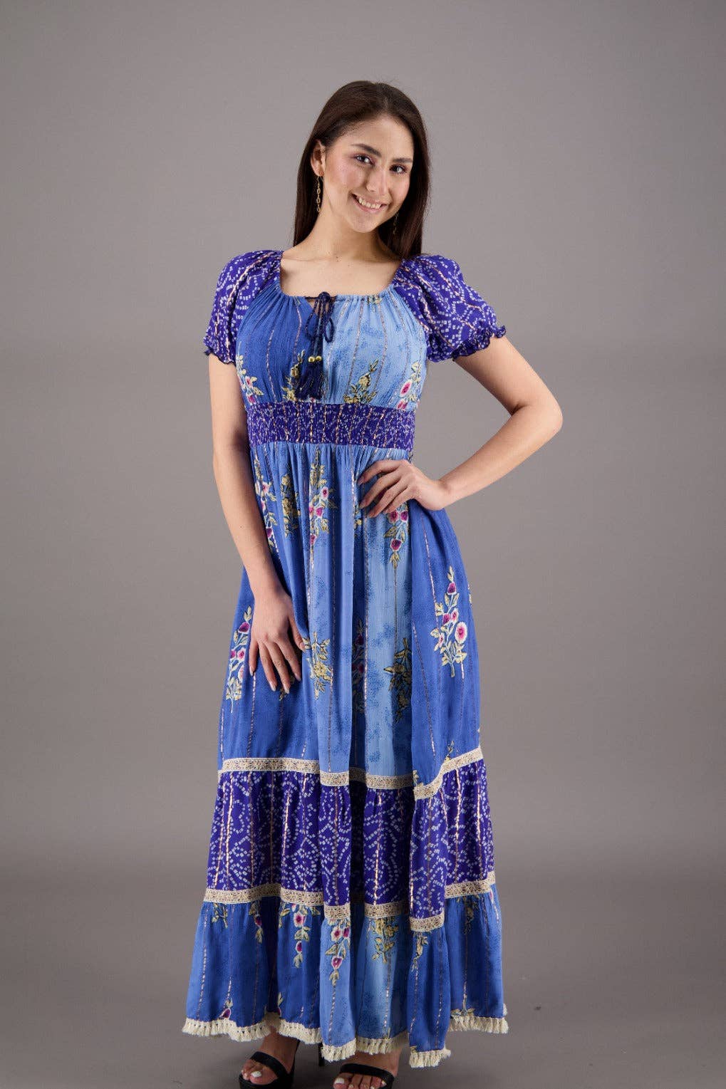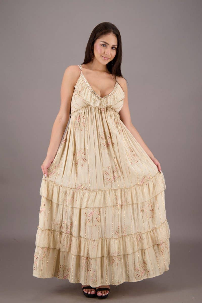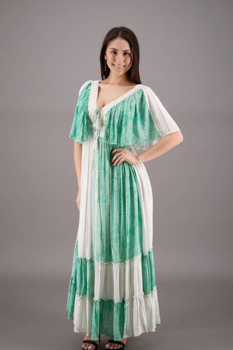 O vestido "Radiant Rayon Boho Gleam" é uma combinação perfeita do estilo boêmio com um toque sutil de luxo. Confeccionado com muito cuidado na Índia, é feito de 100% rayon, enriquecido com fios delicados de lurex que captam a luz, acrescentando um brilho discreto aos seus movimentos. Com comprimento médio, possui mangas 3/4 e um decote em V que oferece equilíbrio entre cobertura e charme. Disponível em três cores encantadoras, cada opção foi escolhida para realçar o visual boho do vestido. A silhueta possui três camadas em babado na parte inferior, criando um efeito fluido e divertido que destaca o espírito livre do design. Oferecido em dois tamanhos, S/M e L/XL, este vestido celebra a união de conforto e estilo. Abrace a essência do boho chic com esta peça encantadora, perfeita para ocasiões diversas.