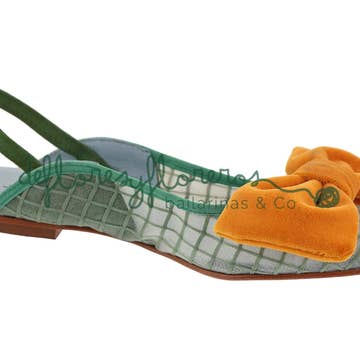• Sola em feltro de lã, tecido em urdidura e trama e tingido na massa. • Sola revestida com filme antiderrapante translúcido. • Parte superior em tecido tweed verde. • Forro em sarja de algodão estampada e forro em veludo laranja.
