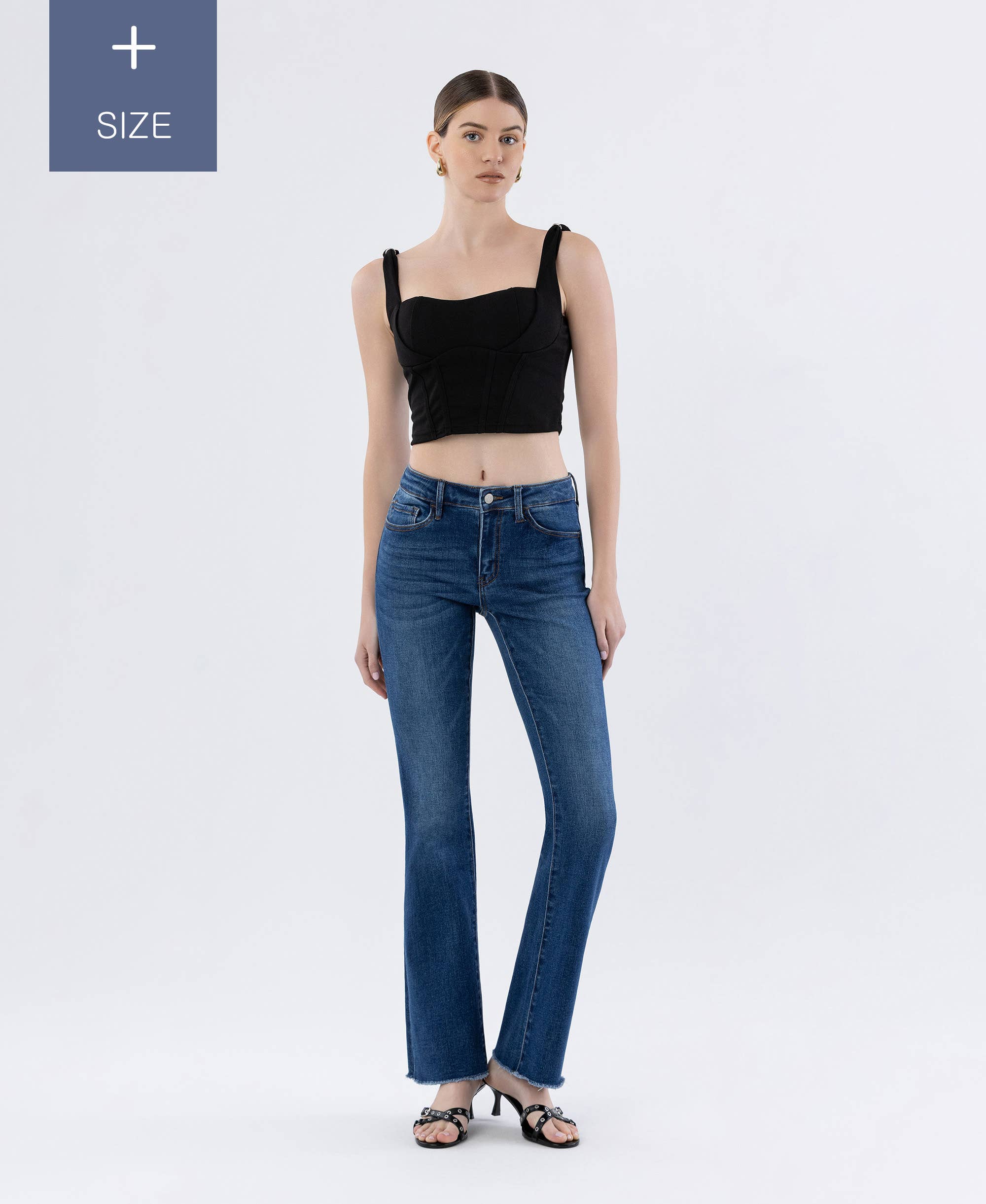JEANS FLARE CORTADOS DE CINTURA SUBIDA TAMANHO GRANDE DENIM ELÁSTICO CONFORTÁVEL, CINTURA SUBIDA, BAINHA ACABADA, COMPRIMENTO CORTADO, JEANS FLARE ALTURA FRENTE: 30,8 CM / ENTREPERNA: 71,1 CM / ABERTURA DA PERNA: 47 CM ESPECIFICAÇÃO BASEADA NO TAMANHO 16W