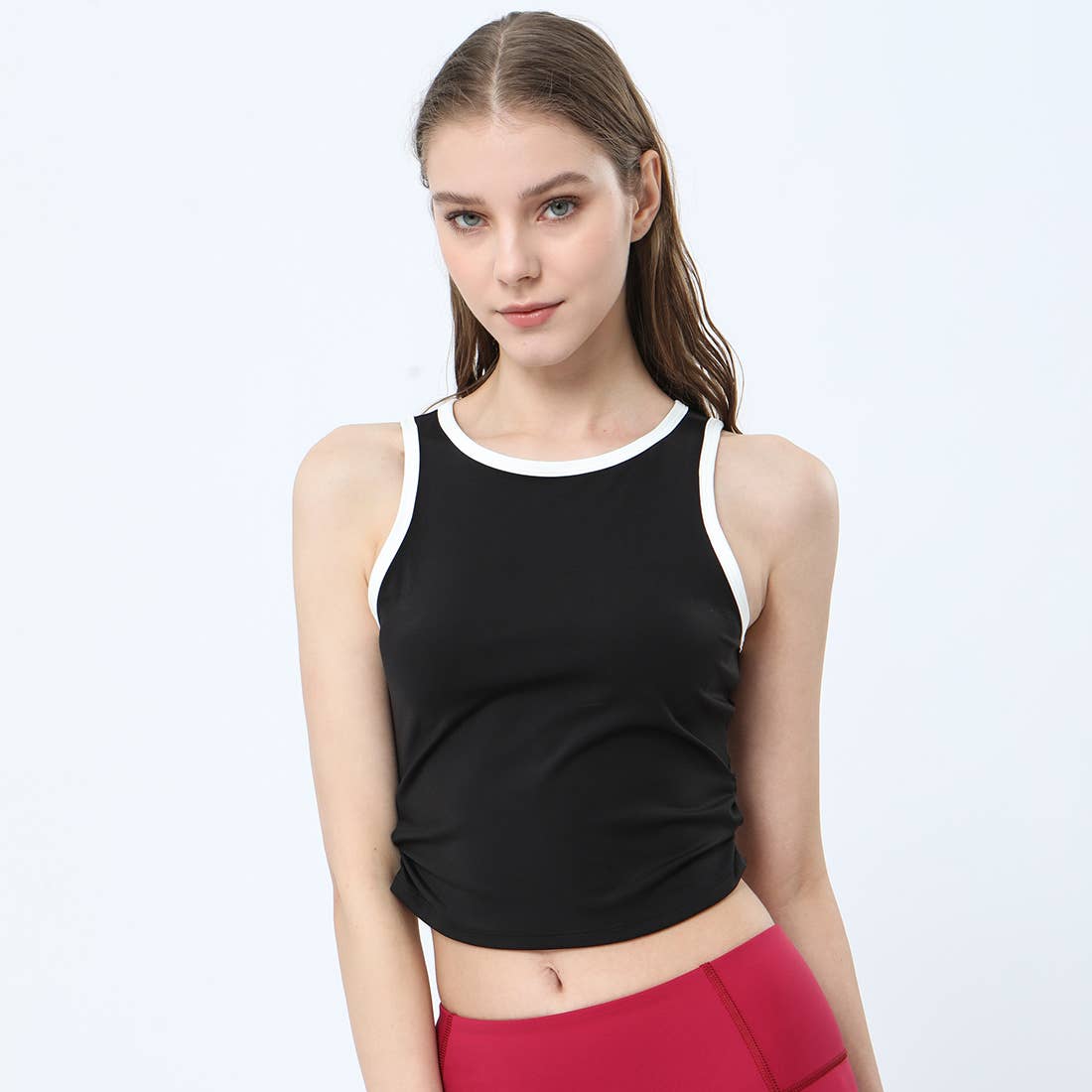 Cobertura total com alças largas, sutiã desportivo de cor contrastante