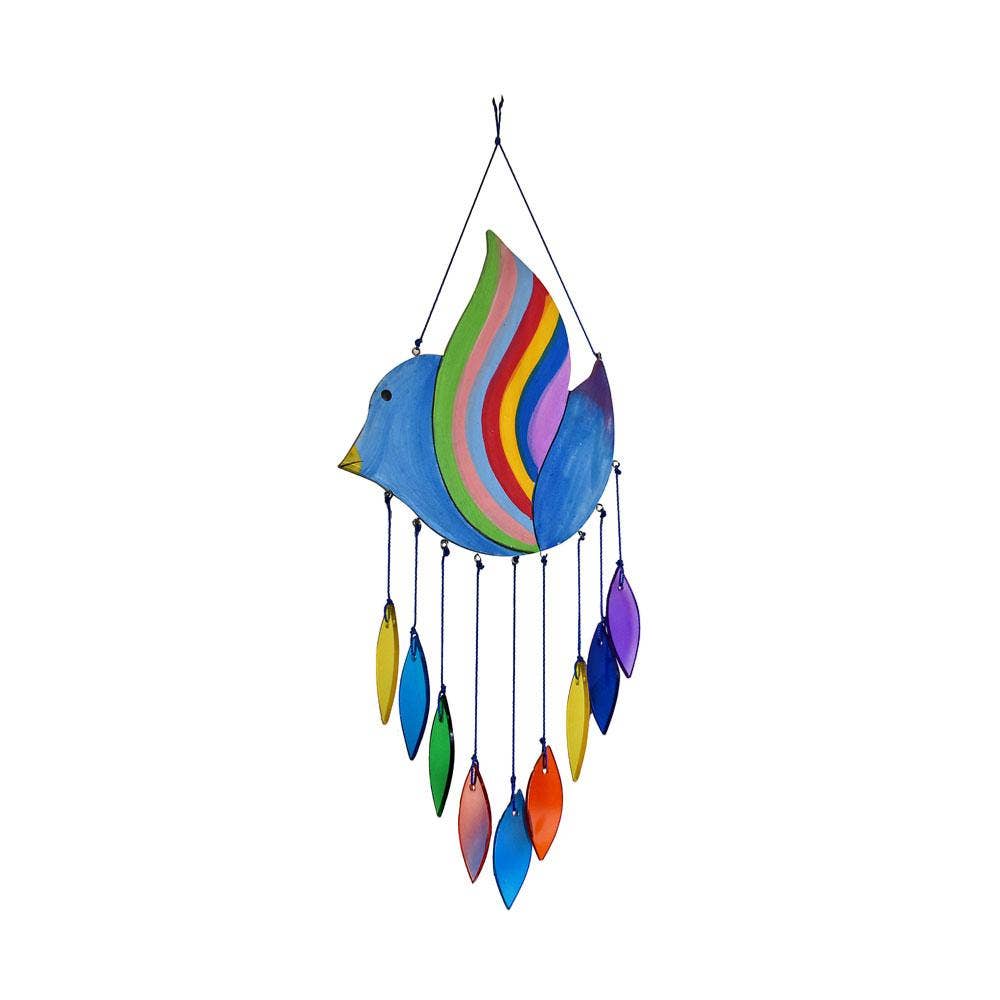 Um móbile ecológico feito de vidro reciclado e madeira flutuante. Sem plástico, sem resina, sem desperdício. Uma ótima forma de reutilizar vidro descartado. O vidro produz um som agradável de tilintar. 15 cordas de formas retangulares penduradas num ramo de madeira Tamanho aproximado: 26(l) x 20(a) mais suspensão Feito por um jovem casal em Tegallalang, Bali, gerando uma renda para sustentar a sua família.
