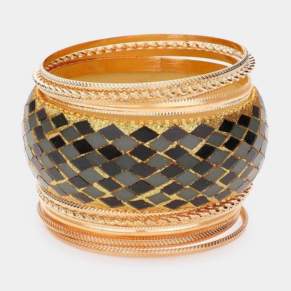 5PCS - Pulseiras Elásticas com Contas de Metal • Tamanho: 1,25" A • Elástico • Compatível com Chumbo e Níquel Conjunto de pulseiras elásticas empilhadas com contas metálicas polidas em tamanhos variados, oferecendo um acessório elegante e moderno para looks diários ou em camadas.