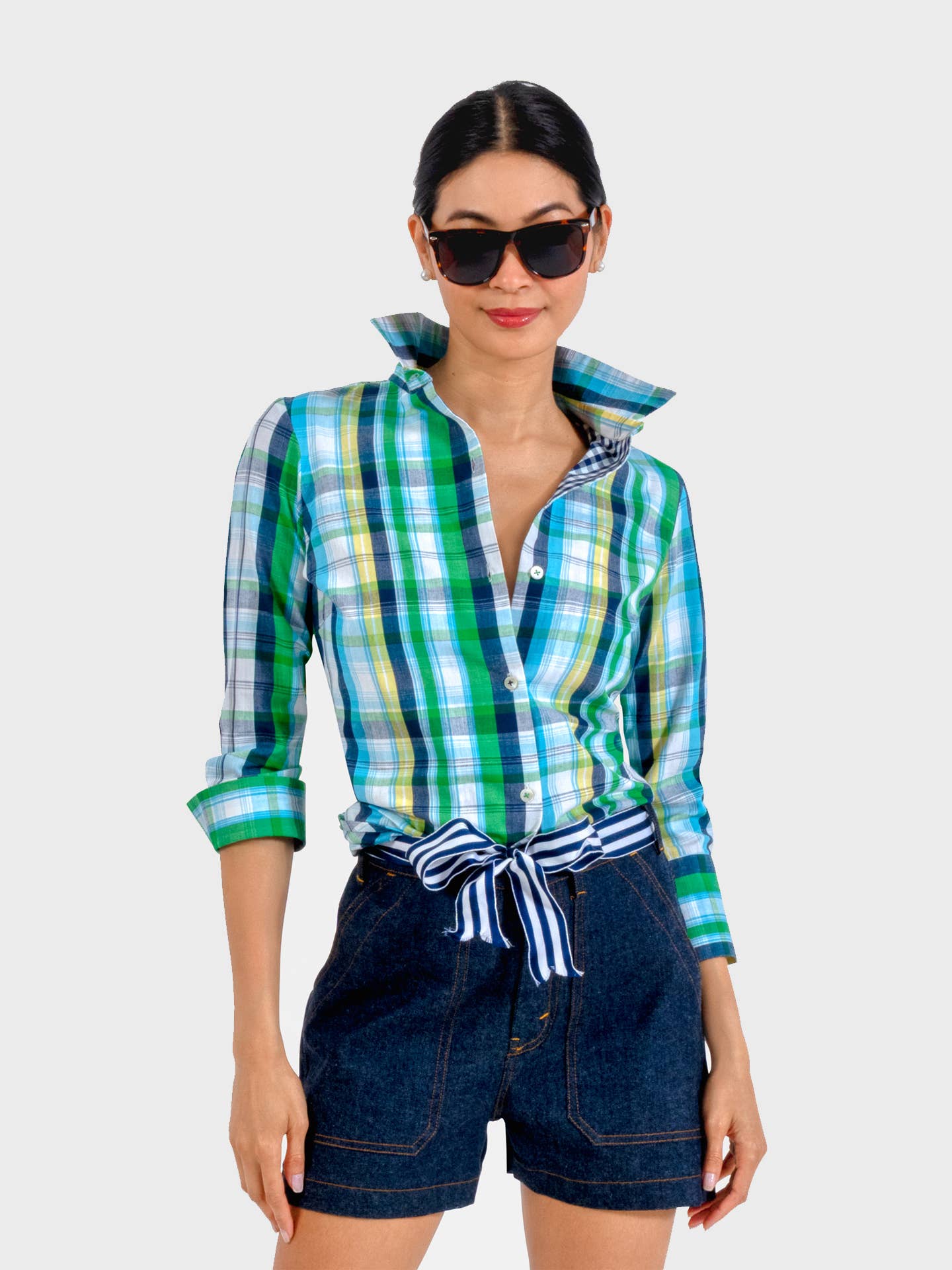 Descrição - Comprimento Total de 26" - Mangas 3/4 - Tecido Contrastante: Painel Traseiro Interno/Colarinho/Punho da Manga - Botões de Concha Tecido e Cuidados - 97% Poliéster/ 3% Spandex - Lavar à Máquina a Frio/Secar na Máquina a Baixa Temperatura ou Limpeza a Seco Tamanhos Disponíveis: XXS (Camarão) - XXXL (Diva) Como Medir BUSTO: Meça debaixo dos braços, ao redor da parte mais cheia do peito. CINTURA: Meça ao redor da sua linha de cintura natural, mantendo a fita um pouco solta. QUADRIL: Meça ao redor da parte mais cheia do corpo na parte superior da perna. Ainda não tem certeza de qual tamanho precisa? A nossa Equipa de Atendimento ao Cliente pode ajudá-lo a encontrar o tamanho perfeito, ligue para 914-465-5180 ou envie um e-mail para customerservice@gretchenscott.com