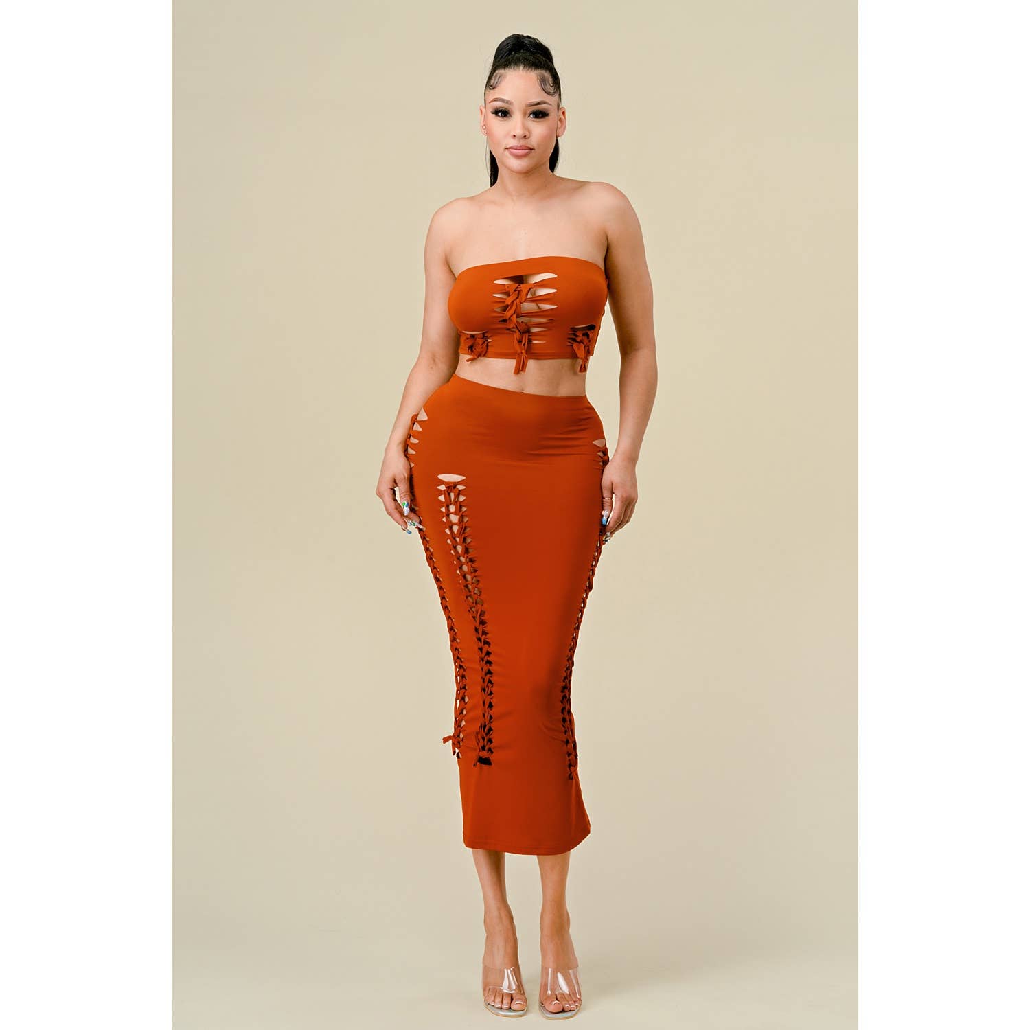 Conjunto de camisa e calça em couro sintético elegante