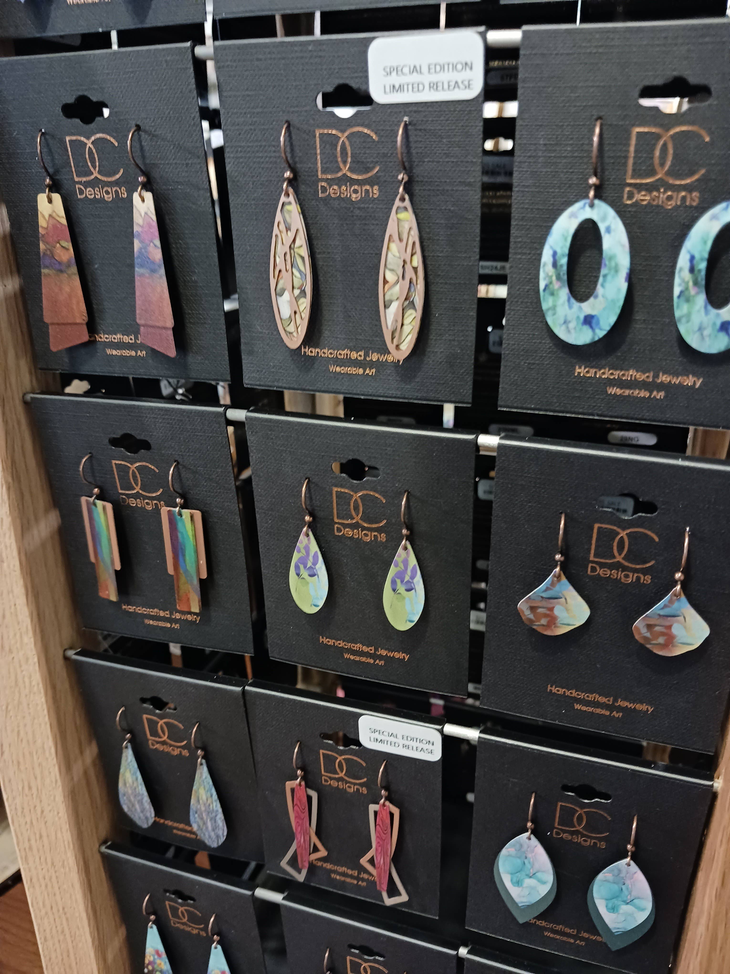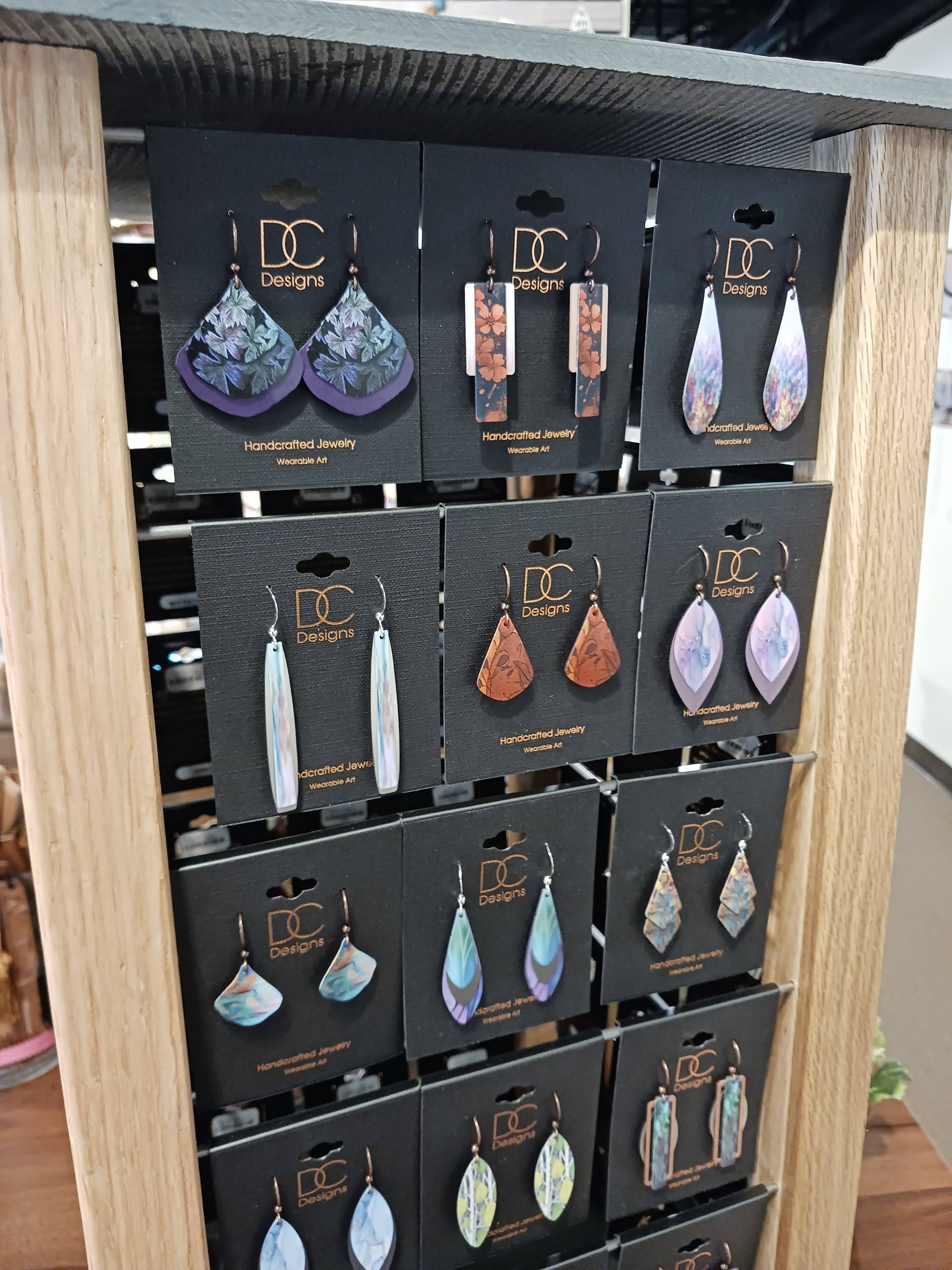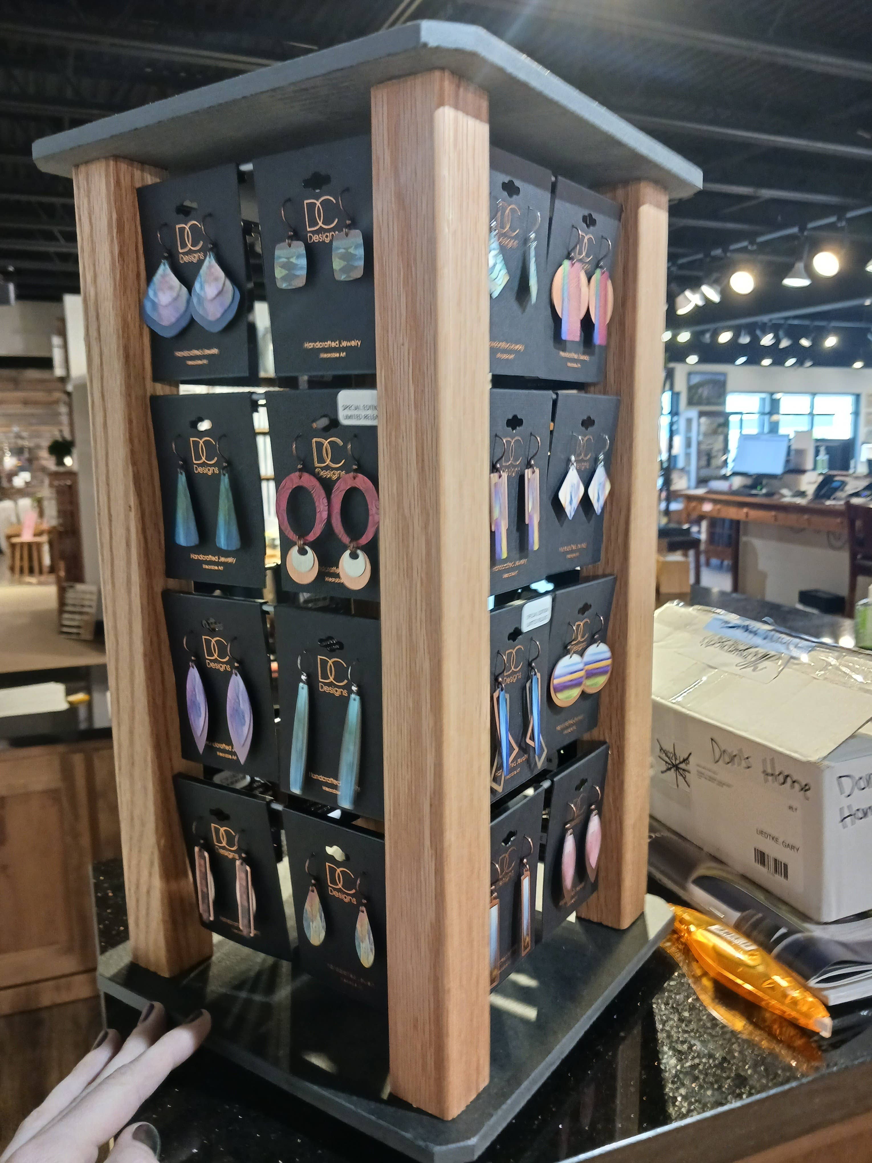 Trouxemos os nossos primeiros 45 pares de brincos de metal Illustrated Light & DC Designs com spinner após o Atlanta Winter Market e recebemo-los no final de março/início de abril - e já tivemos que fazer outro pedido de dezenas mais e um suporte maior - *e acabámos de entrar em maio!* Estes chegaram ao chão (uma área de presentes de uma loja de móveis, de todos os lugares!) e foram um sucesso imediato! Incluímos caixa/saco de presente gratuitamente com a compra, e os clientes adoram a arte bonita e o quão leves são. O tamanho médio parece ser o mais popular :)