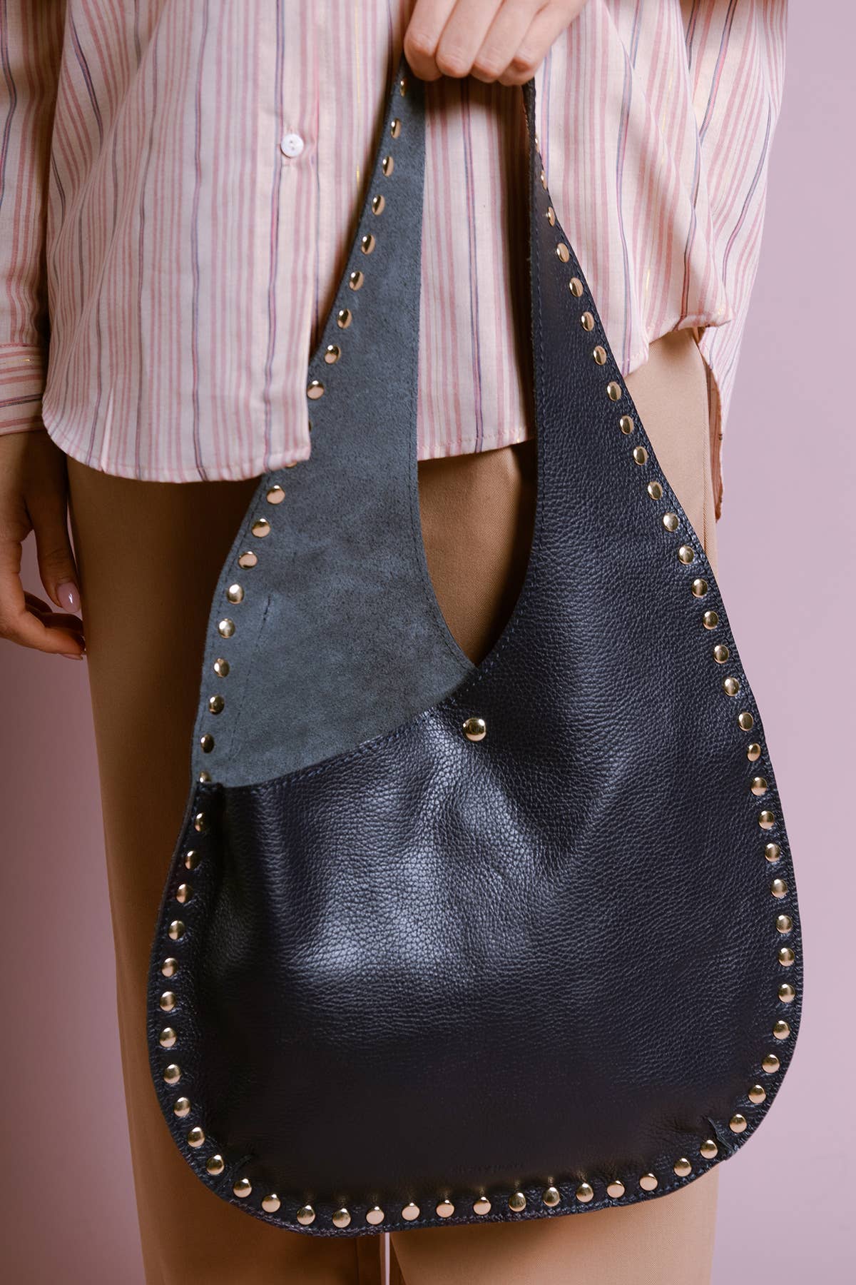Bolsa de ombro em couro de vaca granulado. Fecho magnético. Bolso frontal. Tachas ao redor da bolsa. Dimensão: 35x29x3cm