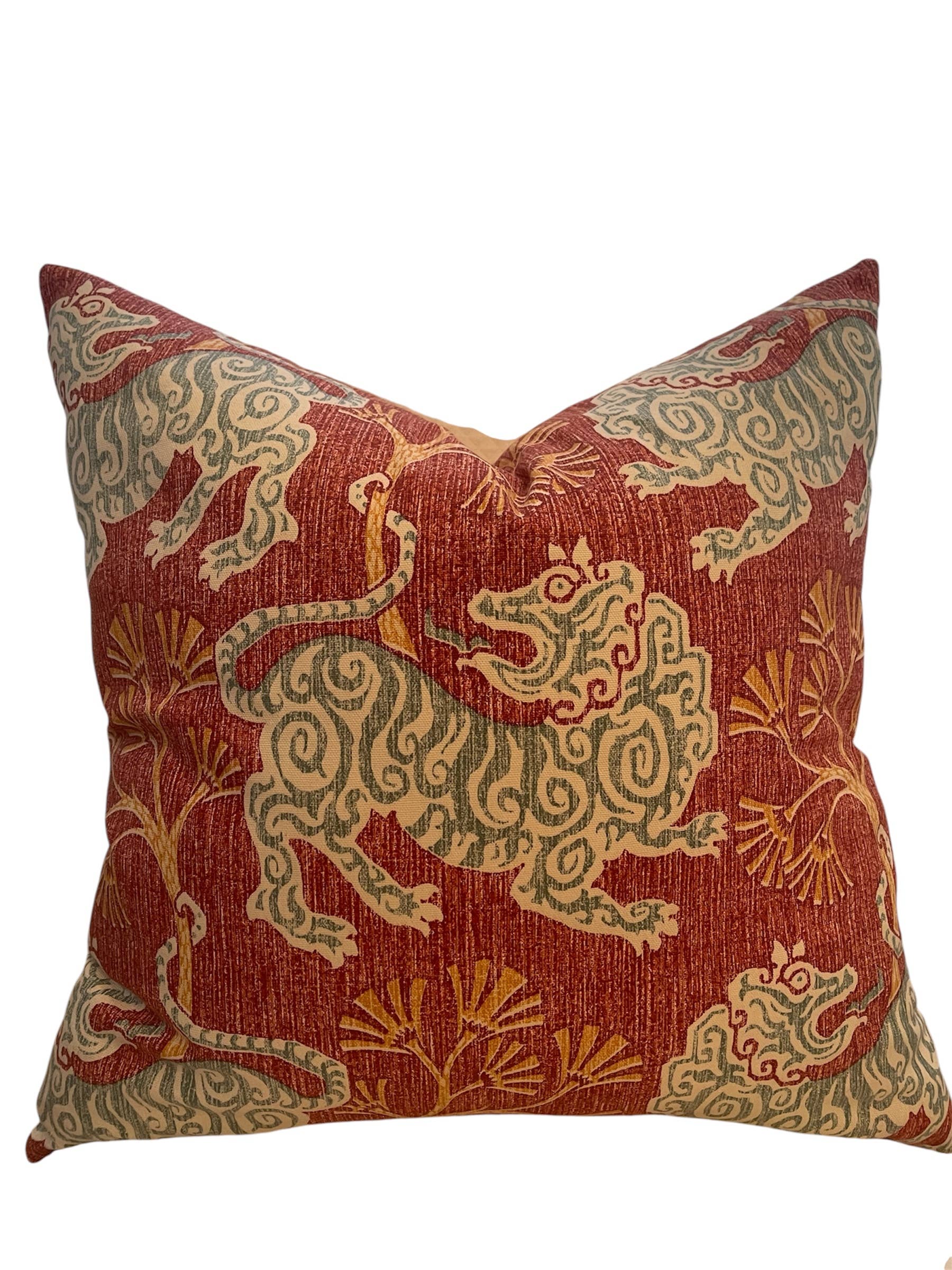 Desenho toile deslumbrante em tons de verde e creme sobre um fundo creme em tecido de algodão. A almofada mede 20 polegadas por 20 polegadas com um enchimento de penas de 22 polegadas (é utilizado enchimento adicional para dar volume aos cantos) e fecho invisível. O mesmo tecido é usado no verso. A almofada é feita na Carolina do Norte.