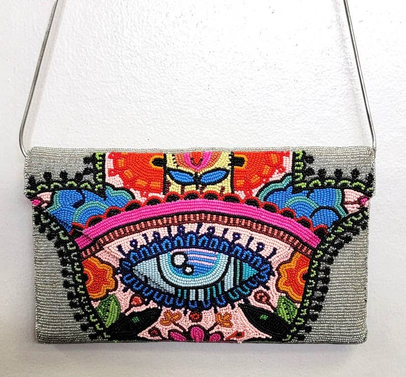 EMBROIDERADA À MÃO, COM MISSANGAS EM TODOS OS LADOS, FLORAL MULTICOLORIDO, TOTALMENTE FORRADA, CLUTCH COM CORRENTE A TIRACOLO