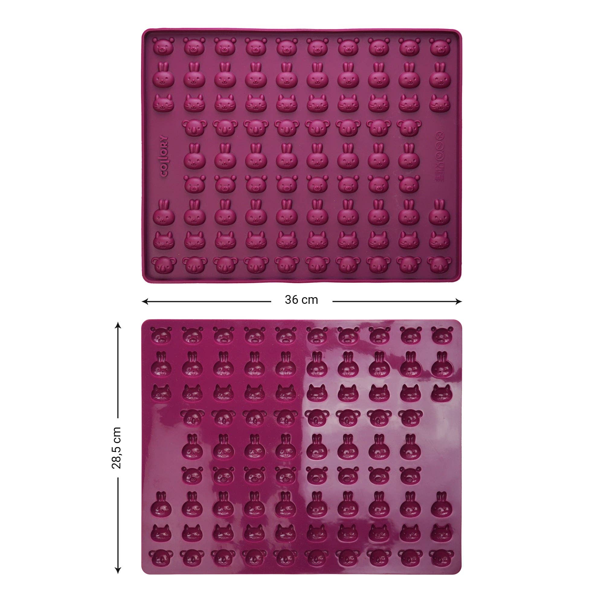 Tamanho da forma (comprimento x largura): 1,5 cm x 1,4 cm Espessura: 0,8 cm Número de unidades por tapete: 244 Tamanho total do tapete de forno: compatível com uma assadeira padrão.